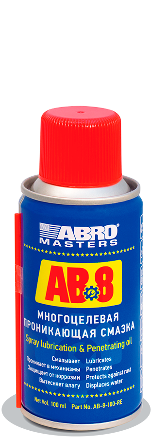 Смазка ABRO Masters АB-8-100-R универсальная, проникающая, многоцелевого применения (100 мл). Преимущество данного варианта в удобстве применения – для нанесения смазки во внутренние полости механизмов достаточно использовать специальную насадку – разбирать деталь не потребуется!