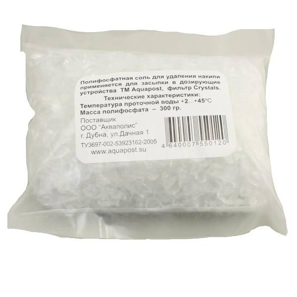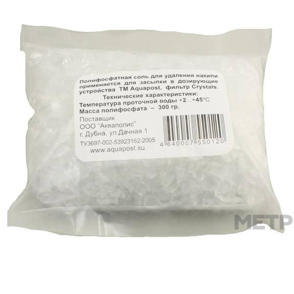 Соль полифосфат 300 гр Aquapost применяется для умягчения технической воды. Снижает вероятность образования накипи в стиральных машинах, котлах и водонагревателях. Нельзя использовать для умягчения питьевой воды.