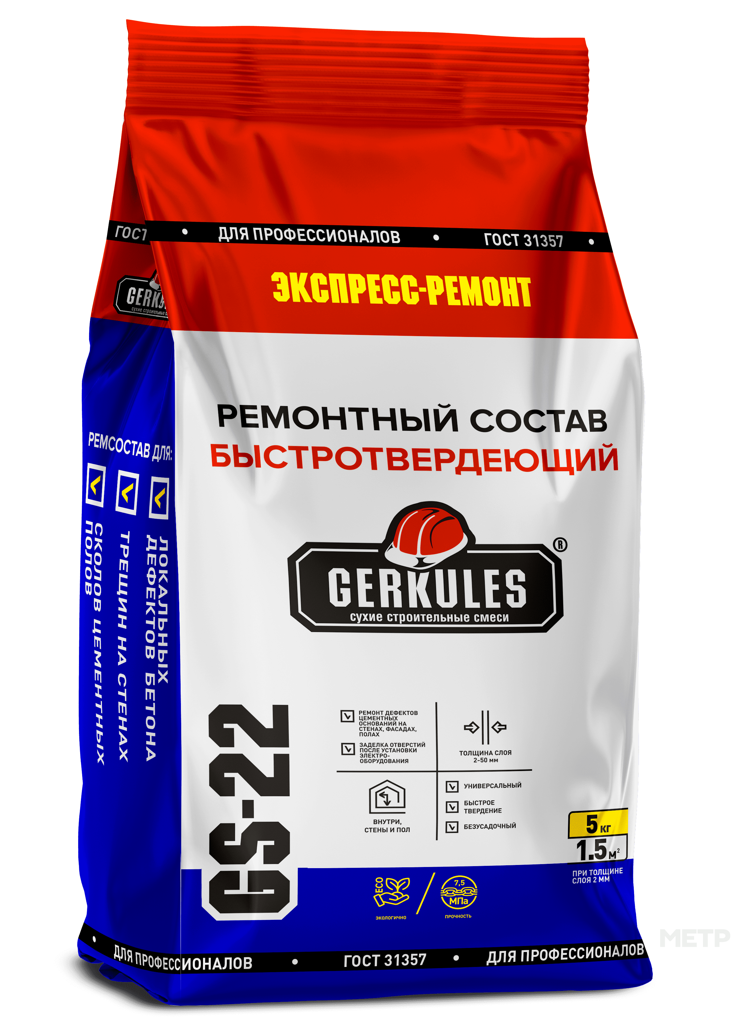 Состав ремонтный Геркулес GS-22 5кг предназначен для восстановления и ремонта всех видов минеральных поверхностей. Раствор твердеет без заметной усадки и обладает хорошей адгезией к минеральным основаниям. Для внутренних работ.