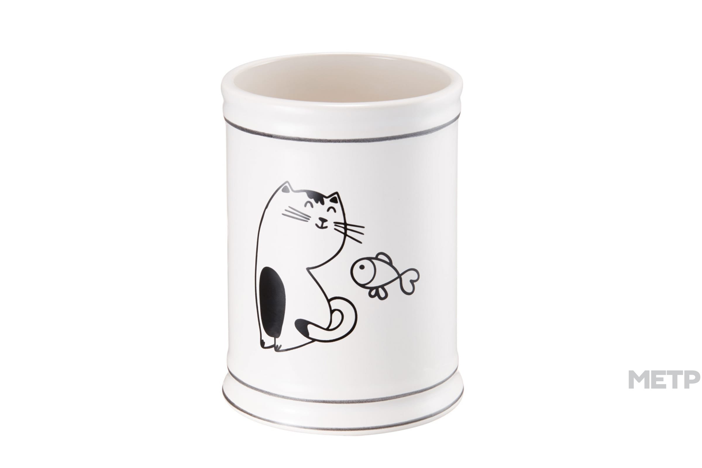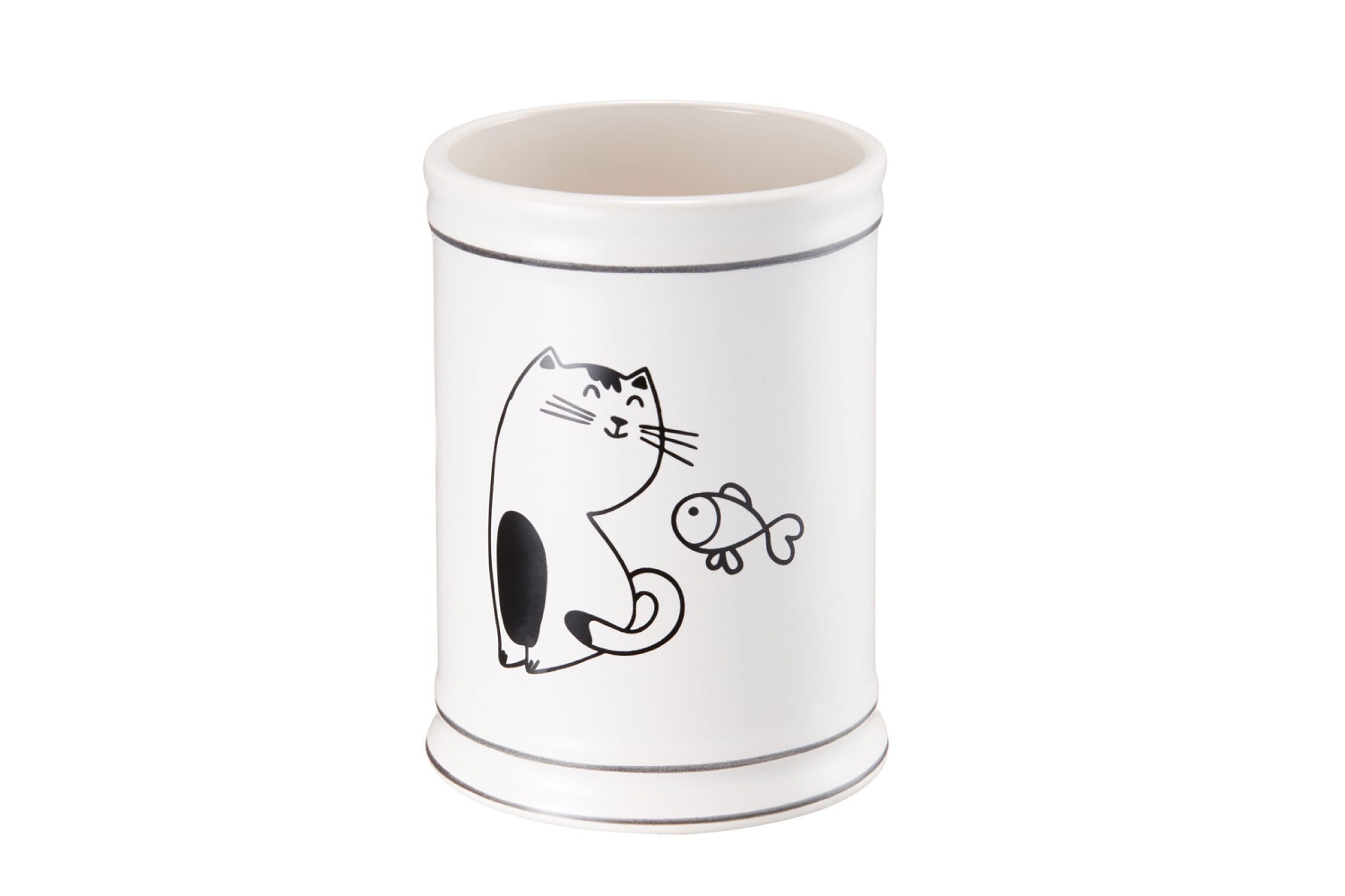 Стакан для зубных щеток Fora Happy Cats с изображением обворожительного котика и рыбки в черно-белом цвете. Выполнен из керамики, за счет чего благородно выглядит и имеет хорошую устойчивость. Подходит для хранения зубной пасты, щеток, станка для бритья. Ставится на ванную полку, прост в уходе.
