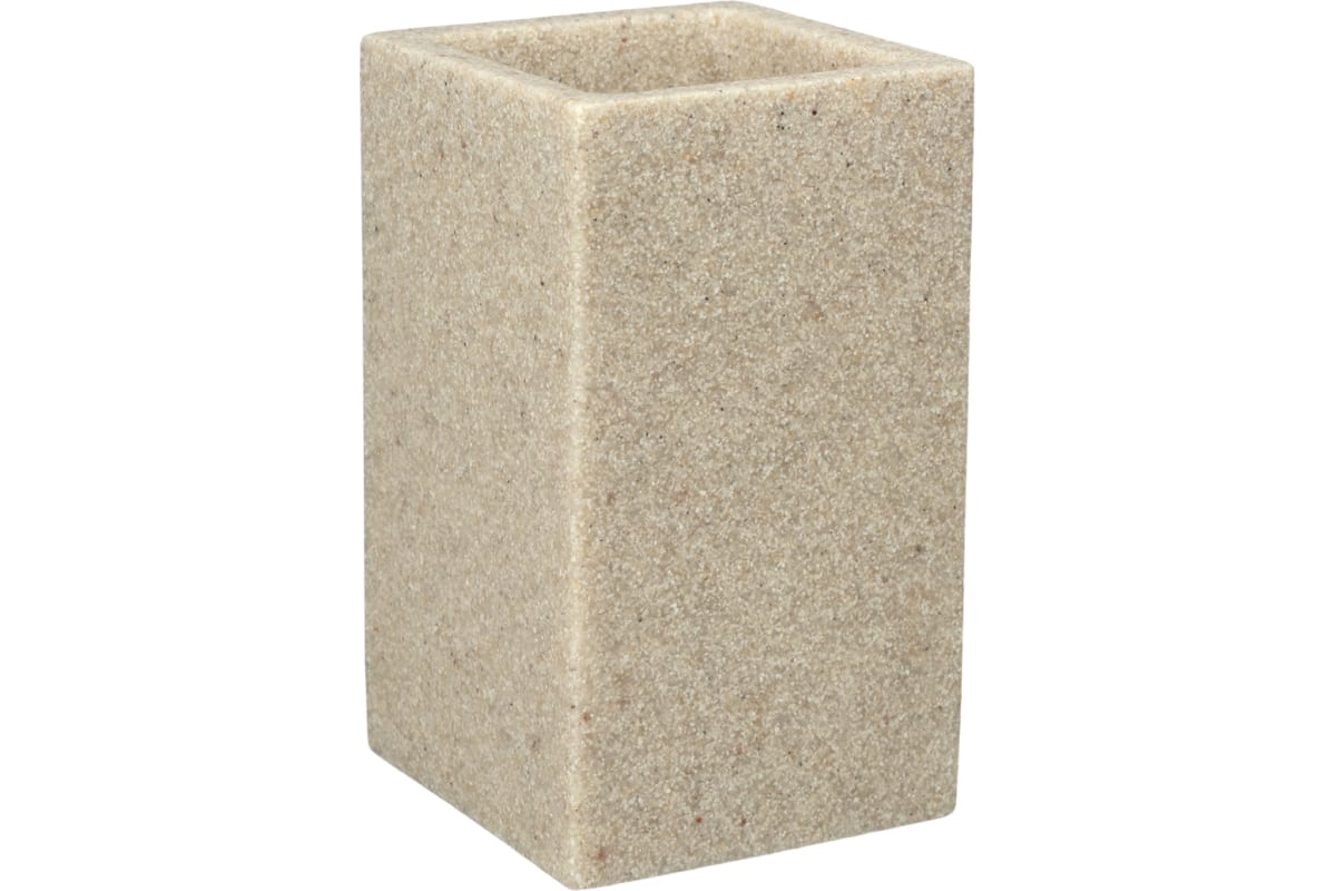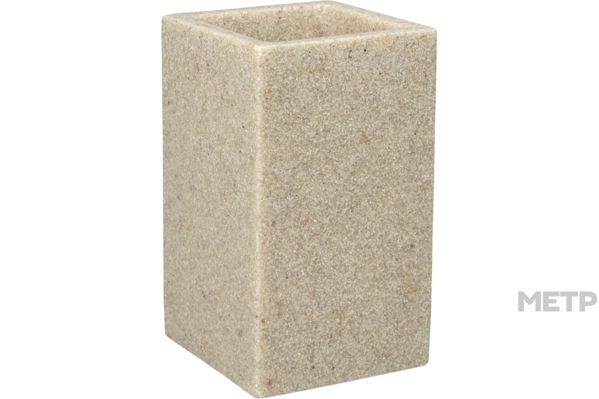 Стакан настольный для хранения зубных щёток, а так же других предметов гигиены (бритвенные станки, кисточки) и зубной пасты. Имеет прямоугольную форму. Изготовлен из полимерный материалного материала (полирезина). Влагоустойчив.