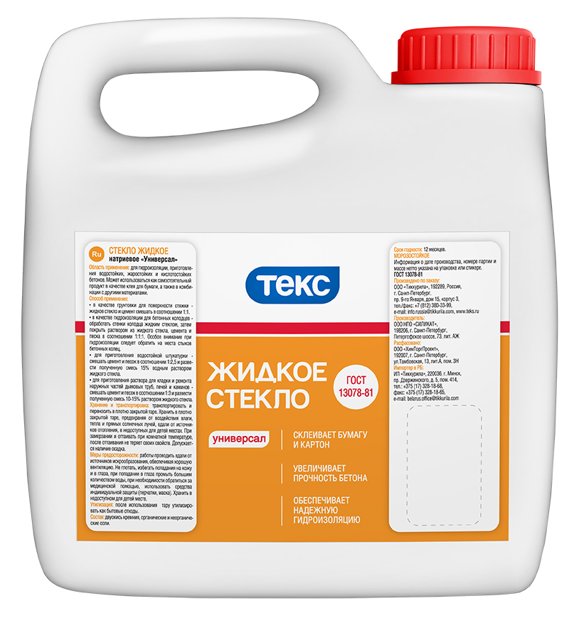 Стекло жидкое натриевое Текс 5 кг, используется для гидроизоляции, приготовления водостойких, жаростойких и кислотостойких бетонов. Увеличивает прочность бетона. Обеспечивает надежную гидроизоляцию санузлов, лоджий, подвалов, элементов фундаментов, коммуникаций и трубопроводов, работающих в условиях повышенной влажности. Склеивает бумагу и картон.
