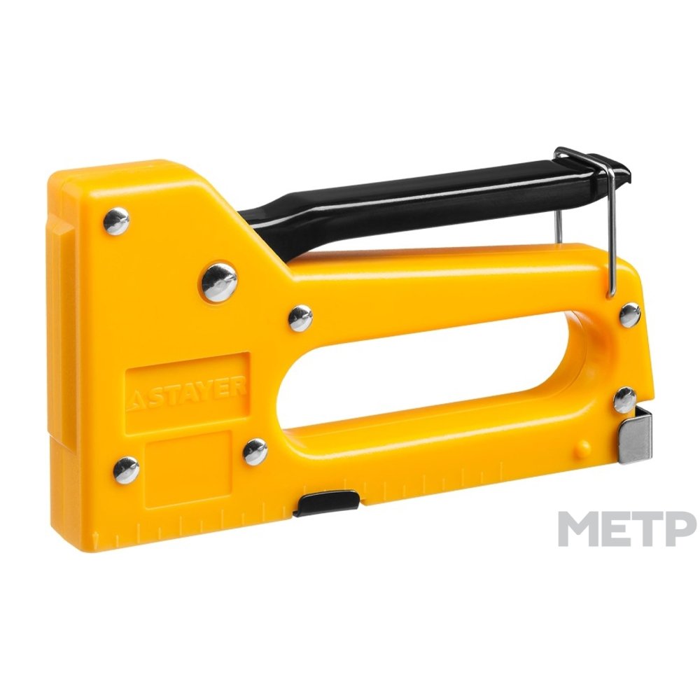 Степлер мебельный тип 53 210 мм используется в основном для обтяжки мебели или обивки новой. Используется для мягких материалов фиксирующихся на деревянной конструкции. На работу, таким образом, уходит значительно меньше времени чем альтернатива - работа молотком. Бывают механические (ручные) степлеры, электрические, пневматические и др.