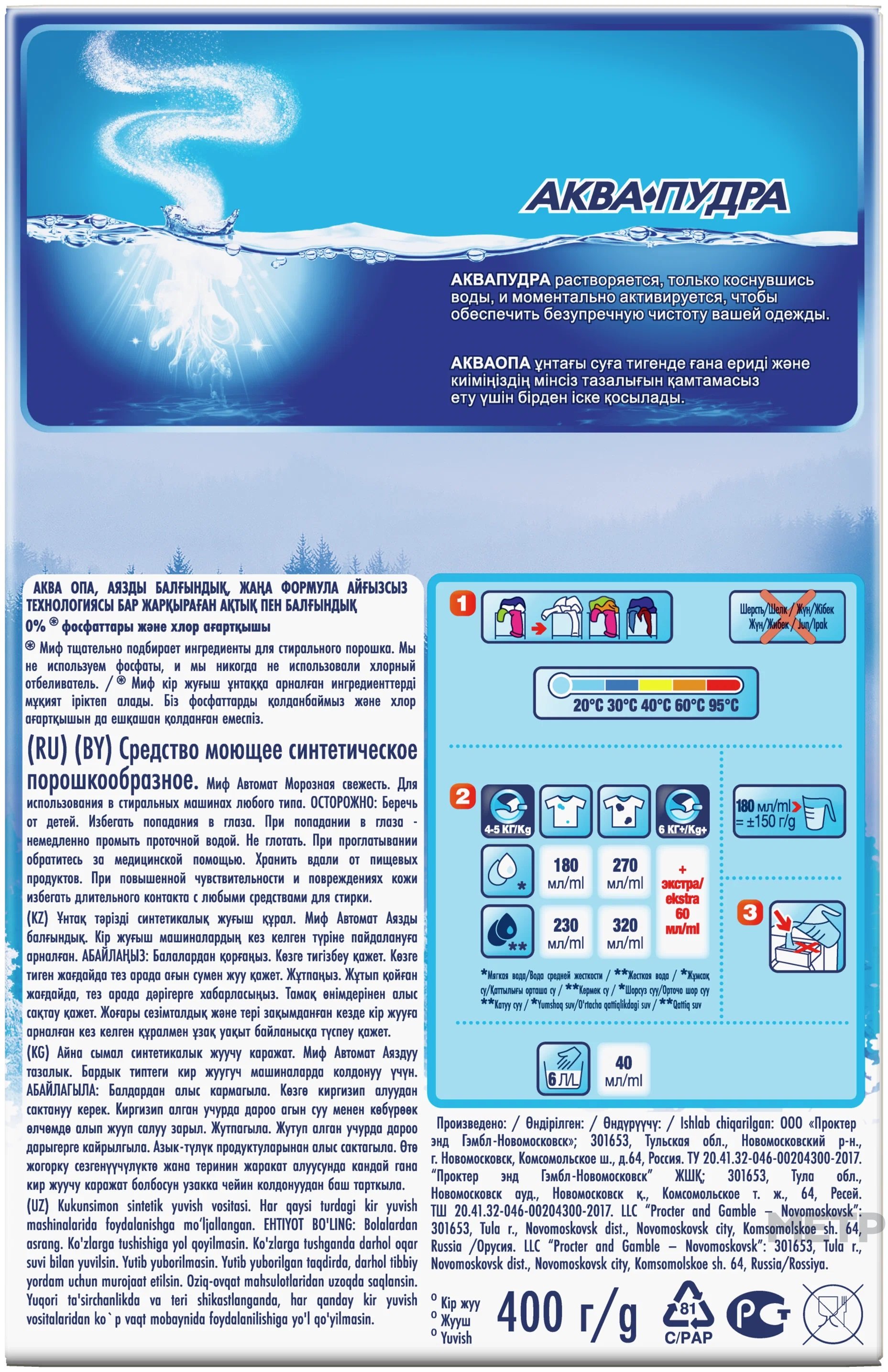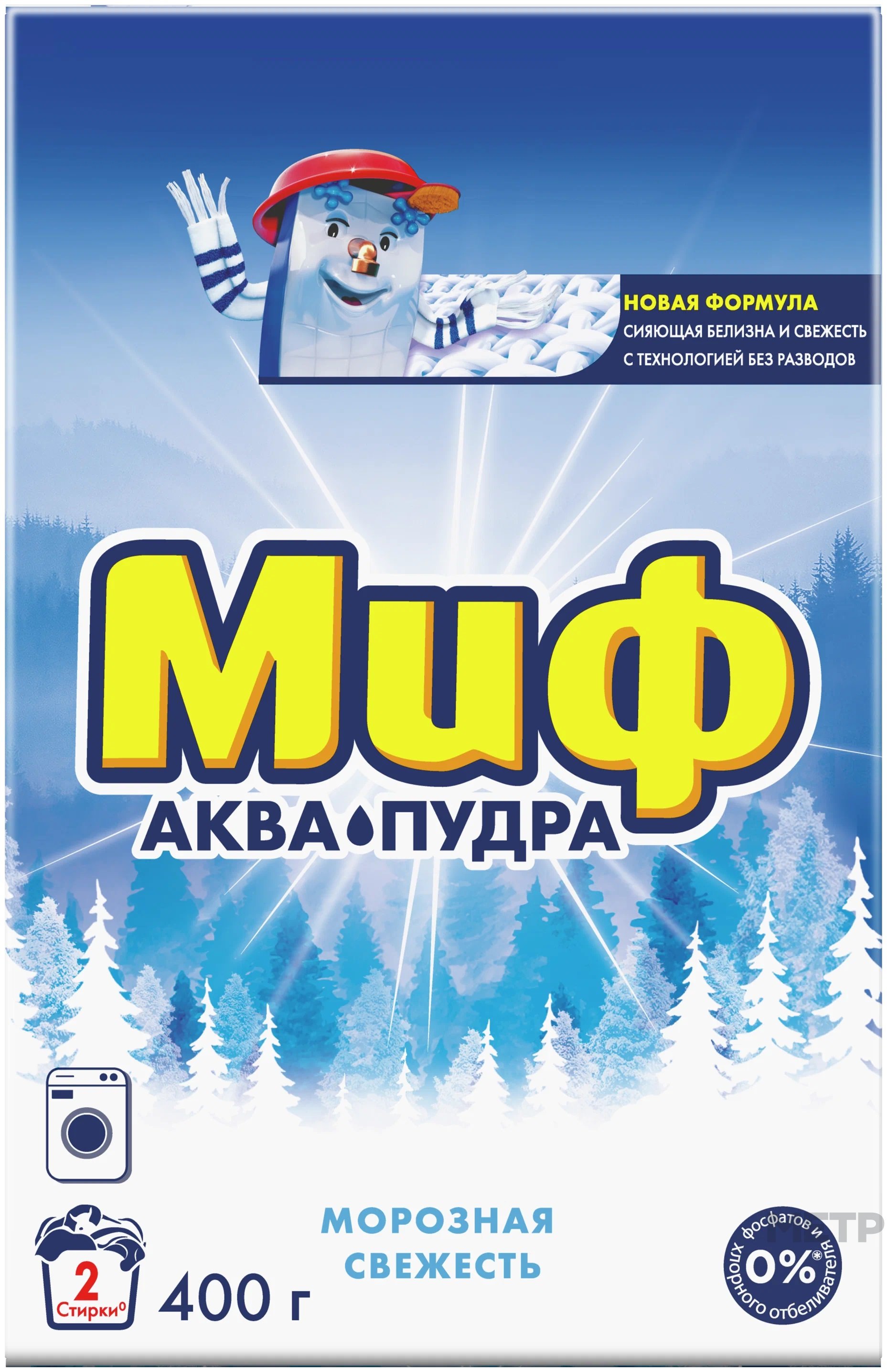 Стиральный порошок Миф Морозная свежесть автомат 0,4 кг справляется даже с самыми сложными пятнами и дарит вашему белью свежий аромат. Предназначен специально для белых тканей. Сохраняет белизну и яркость ваших вещей. Подходит для ручной и машинной стирки. Компактная экономичная упаковка.