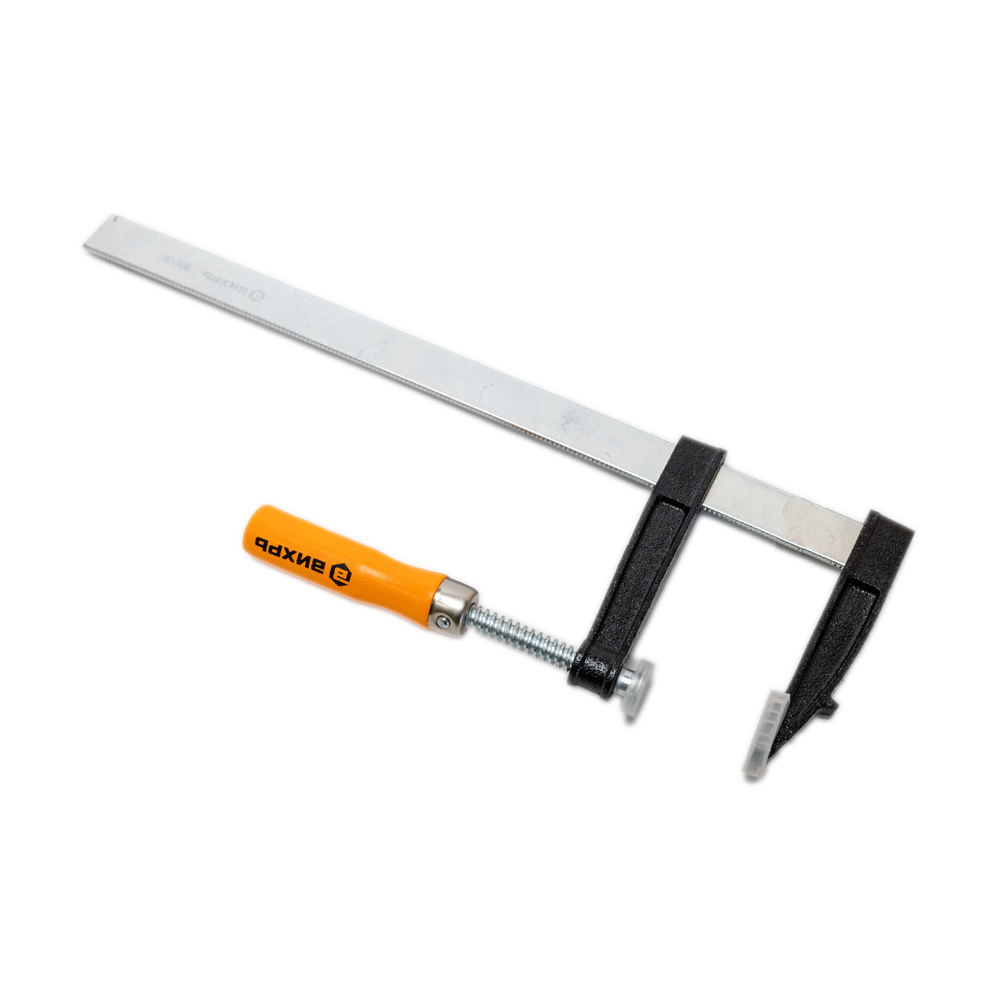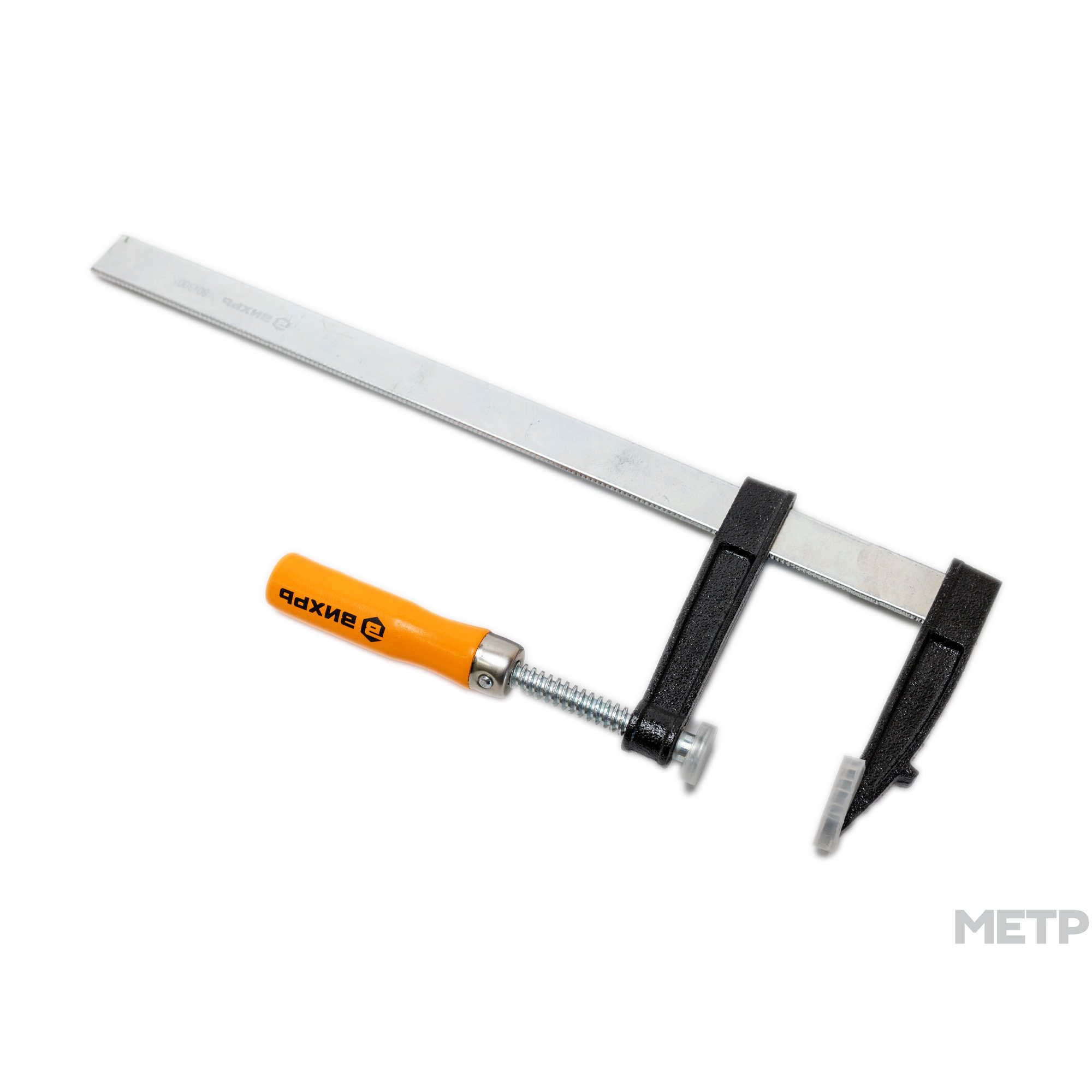 Струбцина F-образная 80х300мм, один из кронштейнов установлен на направляющей жестко, другой перемещается для регулировки захвата и оснащен винтовым зажимом. Губки снабжены накладками для защиты обрабатываемых предметов от повреждений. Рукоятка деревянная. Предназначена для фиксации деталей при обработке и сборке.