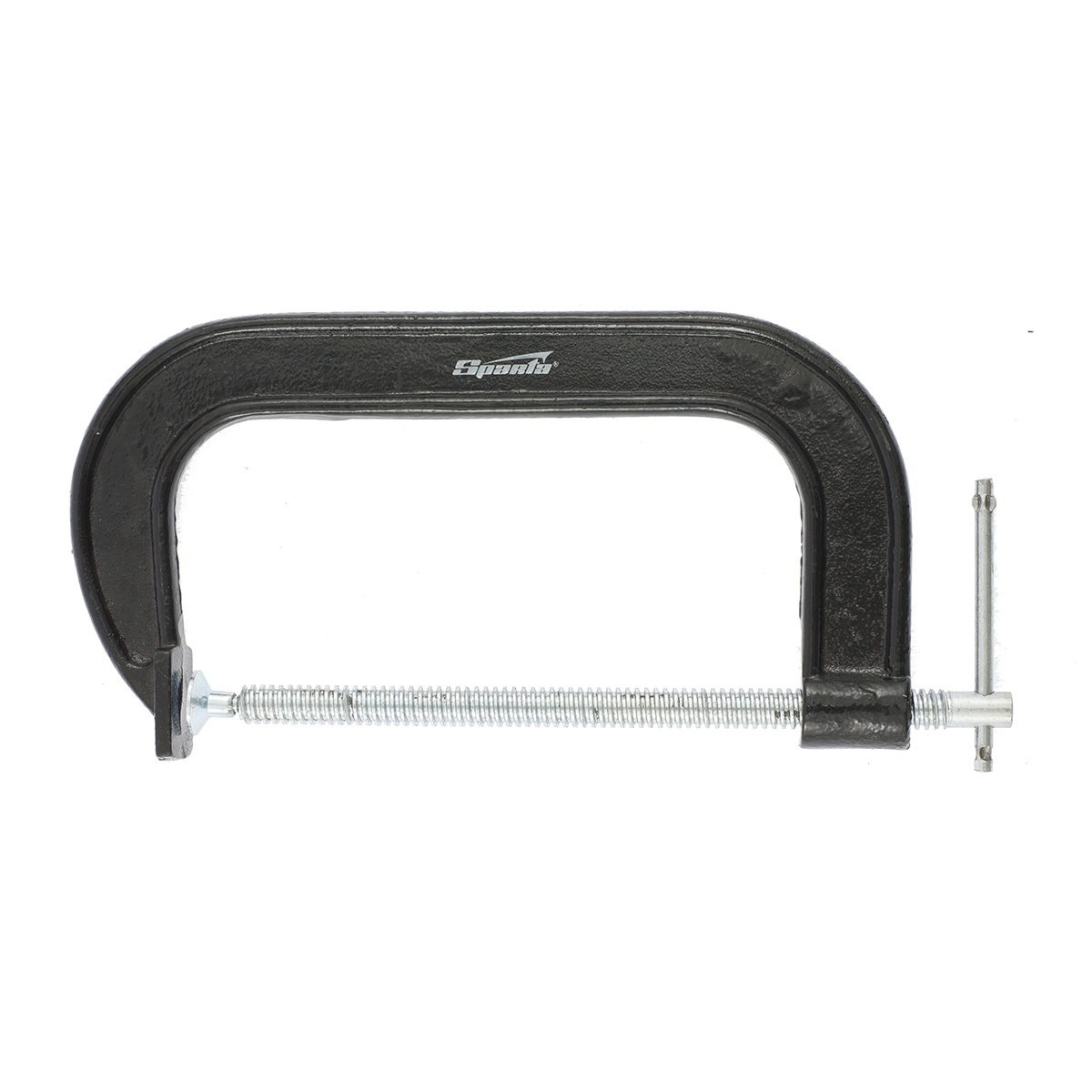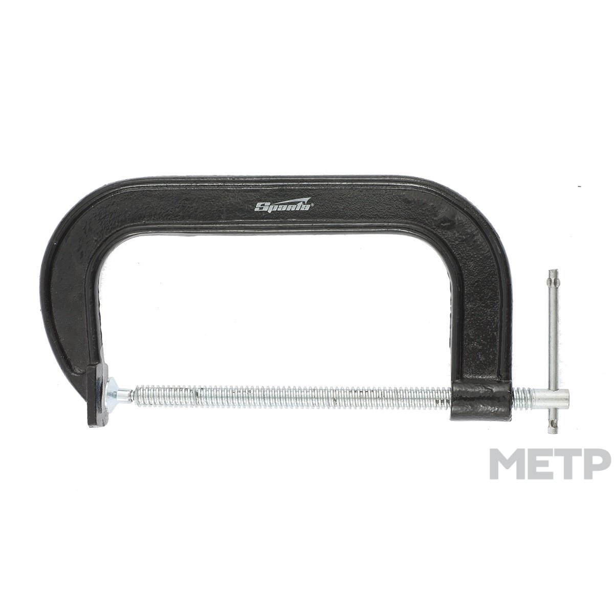 Струбцина G-образная Sparta (300 мм, 150 мм, металл) с пластиковой ручкой. Изделие предназначено для фиксации различных заготовок и их элементов с целью склеивания в единые конструкции, либо выполнения слесарных/столярных работ. Для данной модели характерно повышенное прижимное усилие.