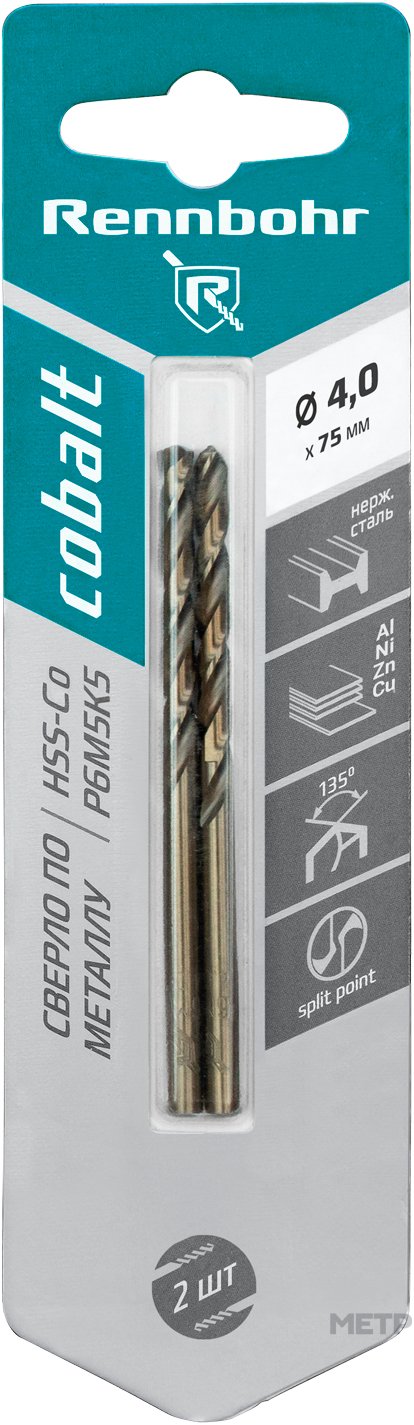 Сверло 4х75мм по металлу цилиндрический хвостовик HSS-CO RENNBOHR применяются для сверления отверстий в нержавеющих сталях, жаропрочных и жаростойких сталях, легированных, высокопрочных конструкционных сталях на универсальном оборудовании, специальных станках с ЧПУ и автоматических линиях. Возможно сверление отверстия глубиной более 4 диаметров без вывода сверла для удаления стружки.