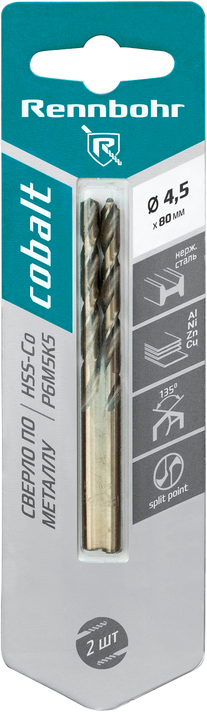 Сверло 4,5х80мм по металлу цилиндрический хвостовик HSS-CO RENNBOHR применяются для сверления отверстий в нержавеющих сталях, жаропрочных и жаростойких сталях, легированных, высокопрочных конструкционных сталях на универсальном оборудовании, специальных станках с ЧПУ и автоматических линиях. Возможно сверление отверстия глубиной более 4 диаметров без вывода сверла для удаления стружки.