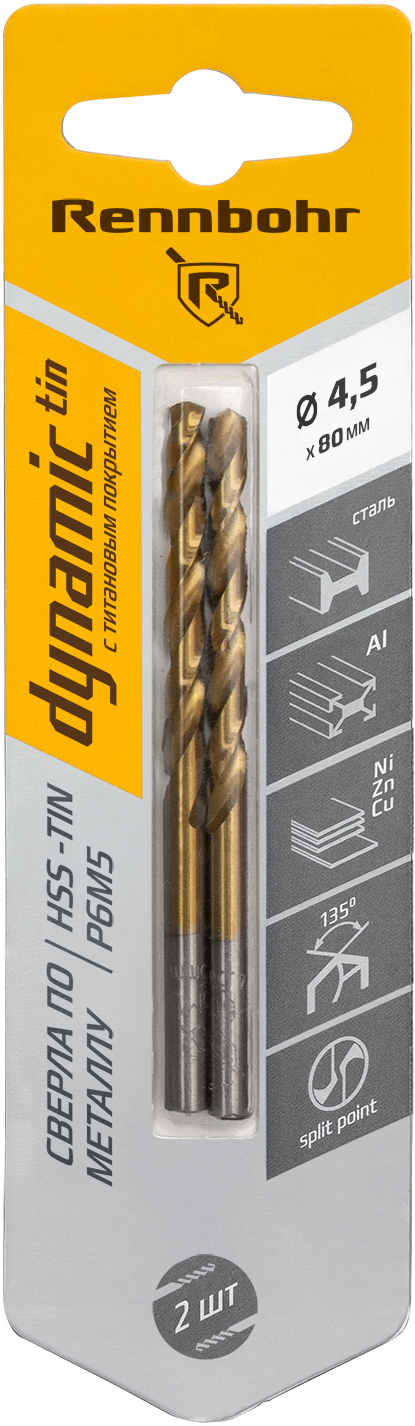 Сверло 4,5х80мм по металлу цилиндрический хвостовик HSS-TIN RENNBOHR предназначено для обработки легированных и углеродистых сталей, цветных металлов, чугуна, пластмассы.