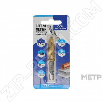 Сверло-метчик М10х1,5мм 26/59мм с титановым покрытием предназначено для создания сквозных и глухих отверстий и нарезки резьбы в легированных и нелегированных сталях, цветных металлах и чугуне.