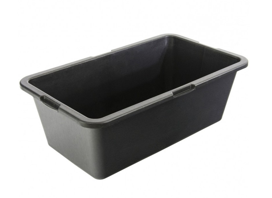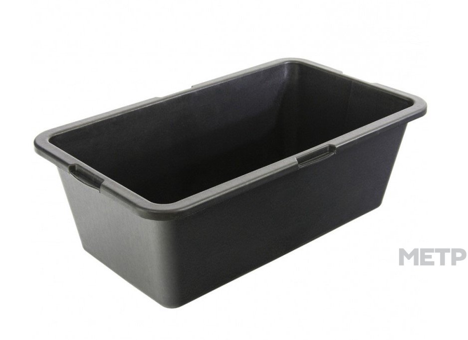 Таз строительный, в виде прямоугольника, вместимостью 90 литров, изготовлен из особо прочной резиновой пластмассы. Строительный инвентарь достаточно эластичен для приготовления различных растворов на основе гипса, цемента или клея. Усиленное дно емкости позволяет замешивать шпаклевку или клеевые растворы механическим способом.