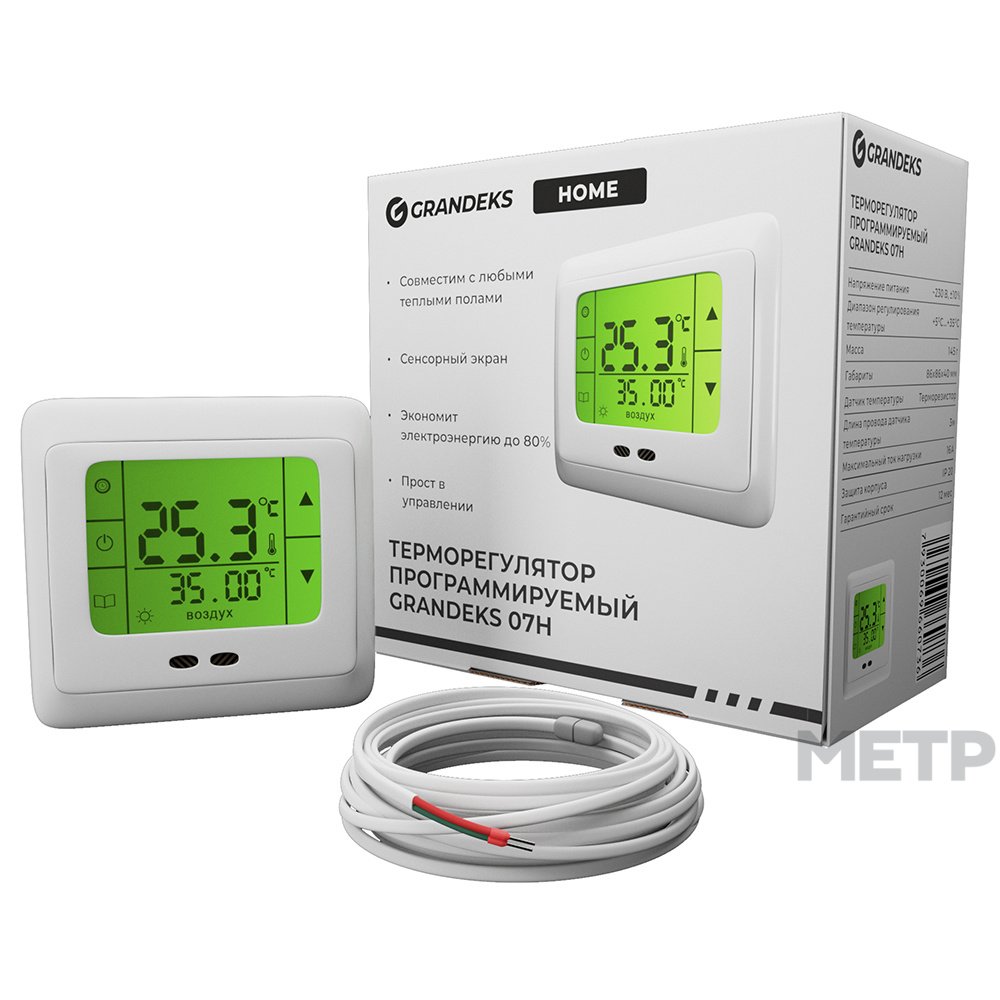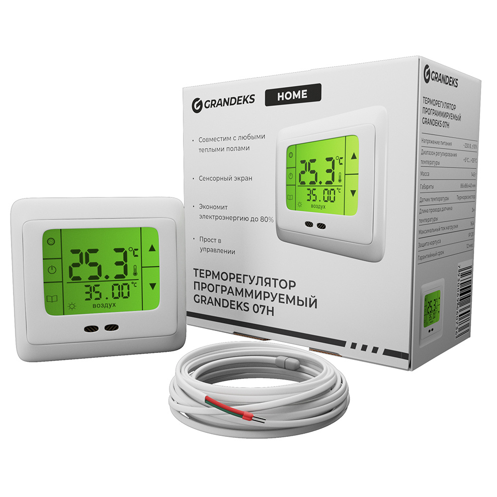 Терморегулятор Grandeks программируемый сенсорный терморегулятор с выносным датчиком температуры пола и встроенным датчиком воздуха. Регулятор позволяет выбрать до 6 режимов обогрева на день, имеется возможность настройки в зависимости от дня недели. Можно существенно экономить потребляемую системой электроэнергию, поскольку включение обогрева происходит при остывании пола на 3°С от заданной температуры. Терморегулятор оснащен функцией «защита от детей». Благодаря большому размеру дисплея читаемость всех символов становится значительно лучше. Терморегулятор легко программируется, дисплей полностью на русском языке. Совместим с любыми системами электрического отопления внутри помещения. При отключении электроэнергии – программы не собьются. Через данный терморегулятор возможно подключения любых тепловых инфракрасных обогревателей, настройка происходит по датчику воздуха.