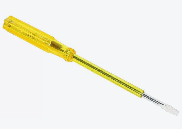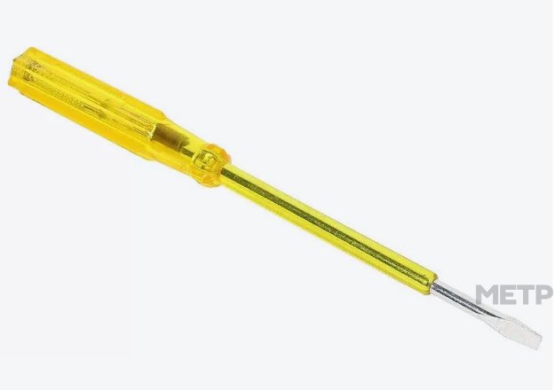 Второй контакт лампочки замыкается пользователем через контакт на рукоятке отвертки. Так как сопротивление тела человека и его емкость являются элементами цепи неоновой лампочки, то лампа загорится, при условии, что в сети присутствует напряжение. Лампа не загорится, пока пользователь не коснется контакта на рукоятке индикатора. Отрицательным моментом индикатора этой модели является относительно высокий порог срабатывания по напряжению – более 60 В, поэтому этот индикатор подходит только для определения наличия фазы и напряжения, а так же индикатором можно пользоваться как простой отверткой при проведении электромонтажных работ. Жало отвертки выполнено в форме плоского шлица. Этот индикатор не определит обрыв электрической цепи.