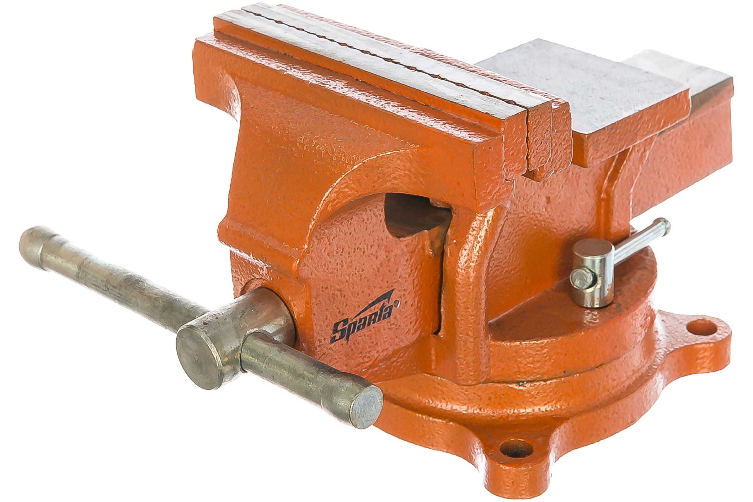 Тиски поворотные Sparta (металл, 125 мм, 80 мм), назначение – слесарные, для работ с металлическими изделиями, включая автомобильные запчасти, детали мебели и т. п. Тиски надежно фиксируют предмет, оставляя при этом возможности для изменения его положения, зависимо от особенностей выполняемых операций.