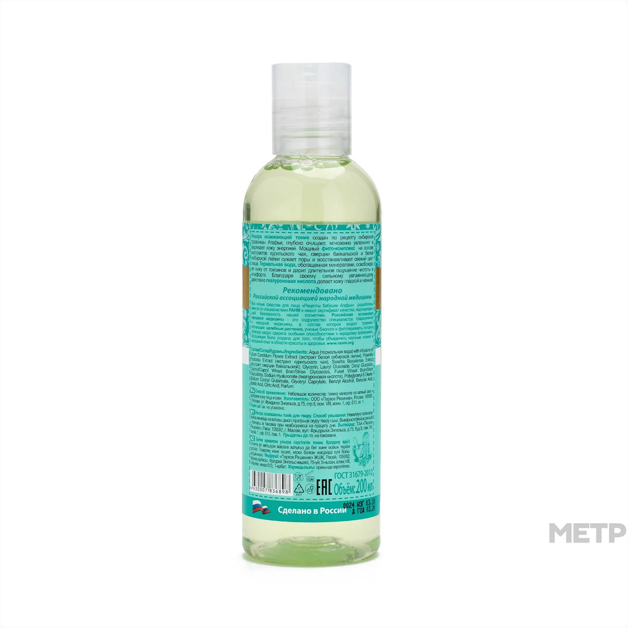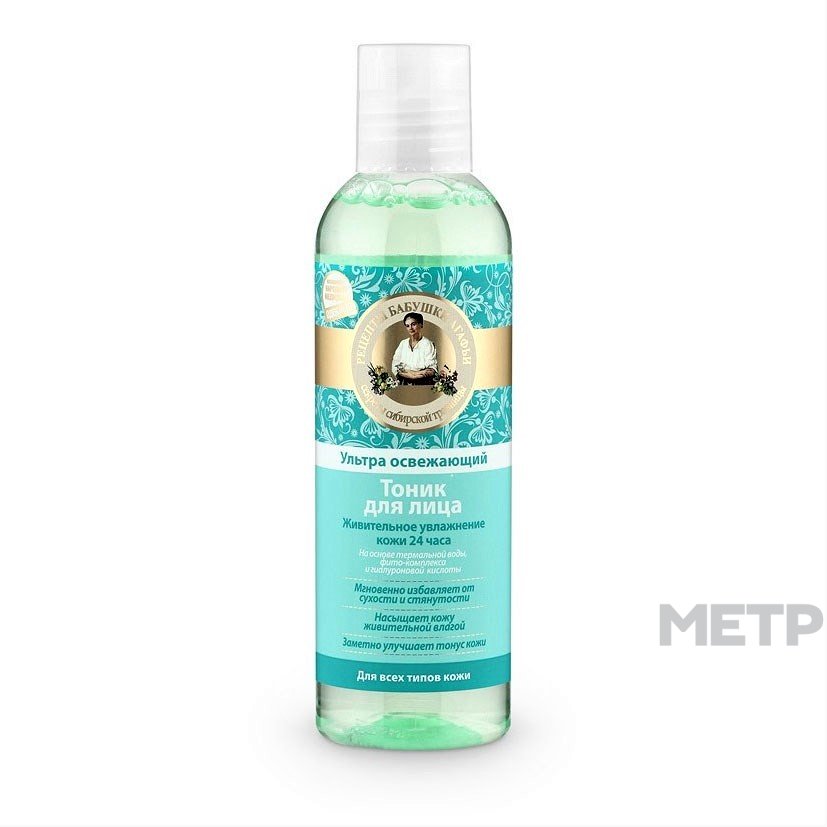 Тоник для лица Рецепты бабушки Агафьи Живительное увлажнение 200 мл подойдет всем типам кожи. Придает ей гладкость и нежность. Улучшает ее состояние за счет обеспечения влагой и выравнивания тона. Борется с тусклостью и осветляет. Удаляет жирный блеск и делает кожу матовой, придавая здоровое сияние.