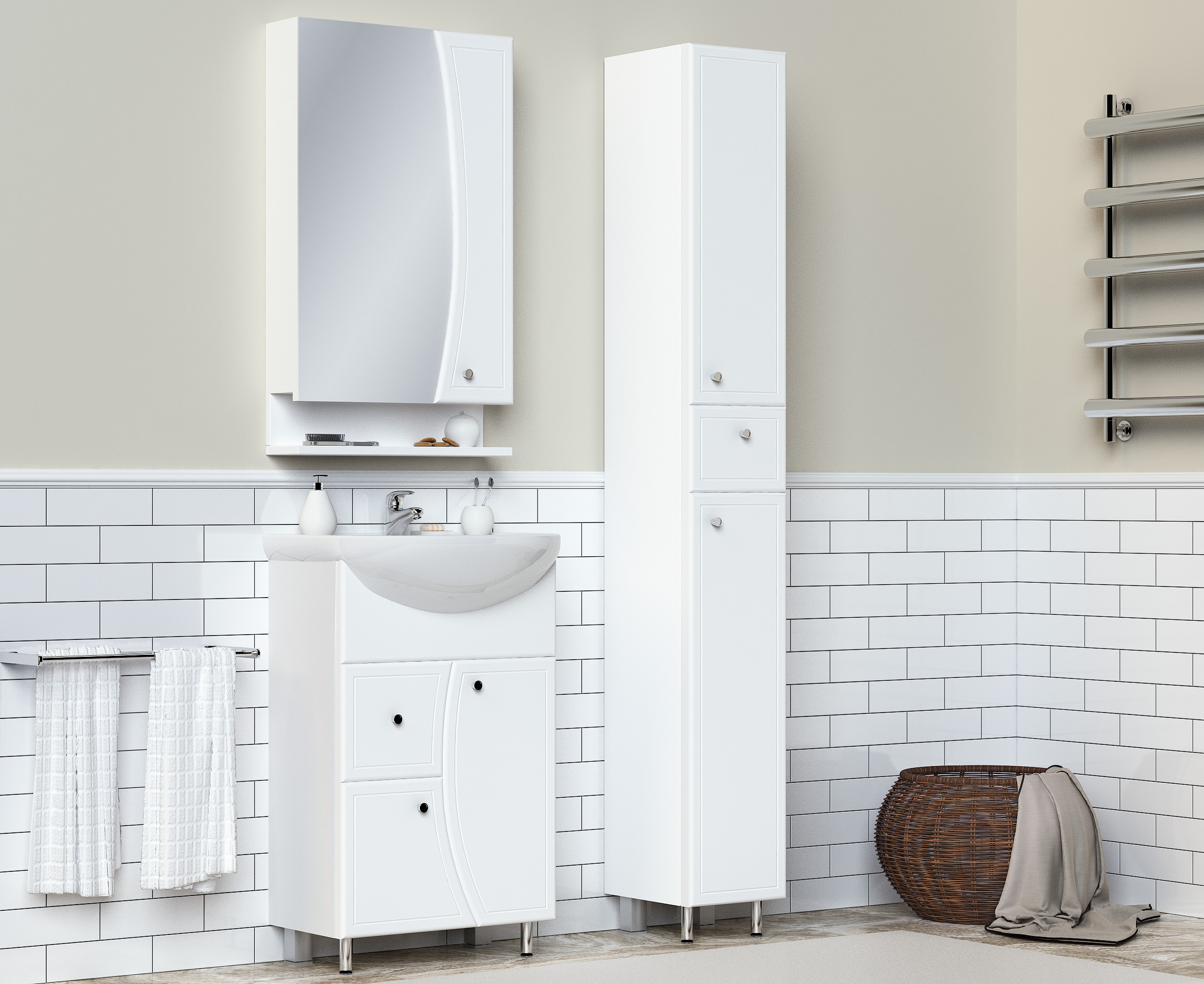 Коллекция Кармель – сочетание элегантности и качества в интерьере ванной комнаты.Четкие, стремительные линии, плавность и гладкость линий в силуэте коллекции отличное дополнение для современной ванной комнаты. Изделие отличается не только оригинальным дизайном, но и функциональностью.В составе коллекции представлены: тумба под умывальник, зеркало с шкафчиком, пенал с ящиком напольный, умывальник.Уверенная внешность, качество в эксплуатации.
