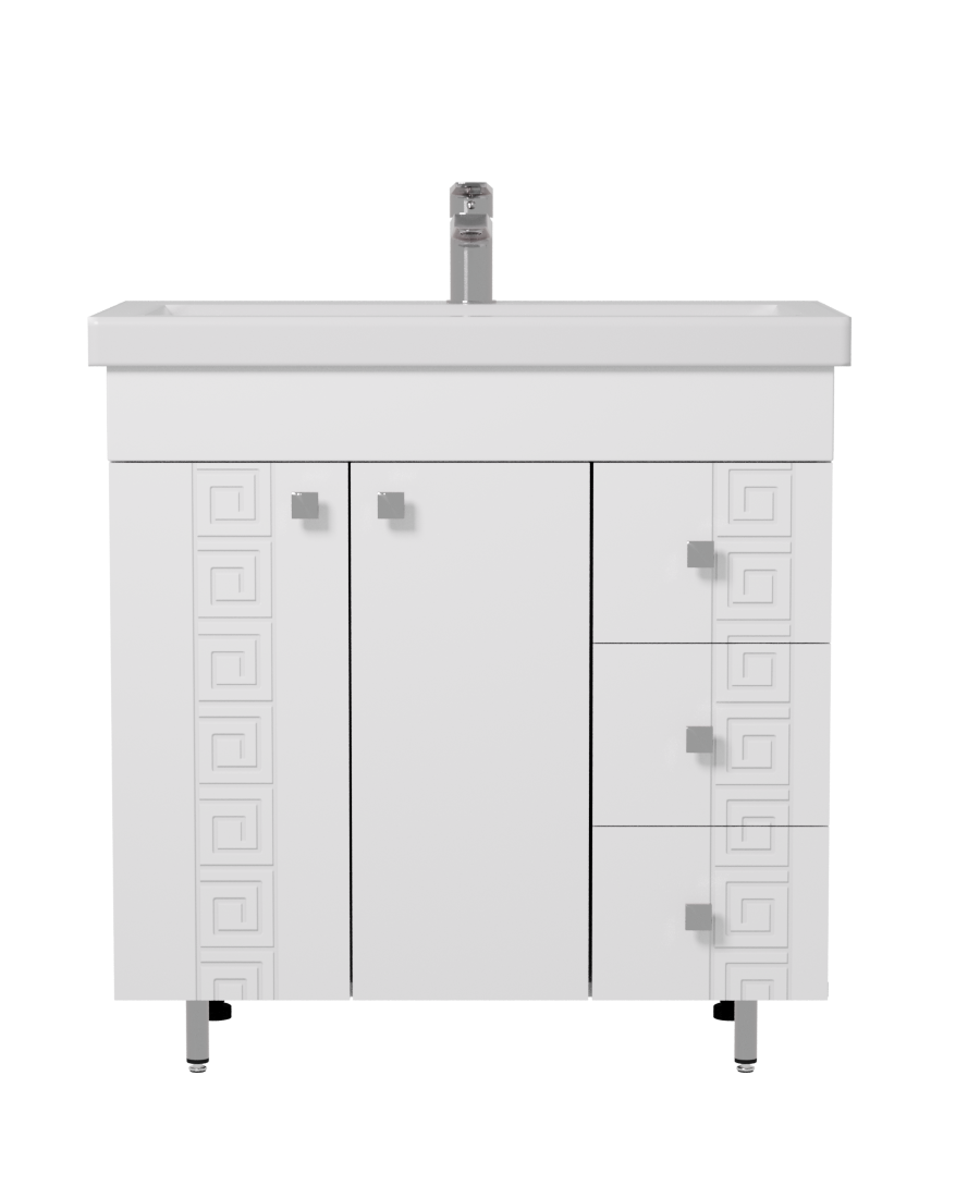 Тумба из коллекции Родос комплектуется умывальником Cersanit Сомо 800 с фасадами в белом глянце и геометрической фрезеровкой, придаёт интерьеру свежесть и динамику. Три выдвижных ящика и распашная дверь обеспечивают удобную систему хранения. Регулируемые по высоте ножки позволяют адаптировать тумбу к любому полу. Отлично подойдёт для современных и светлых ванных комнат.