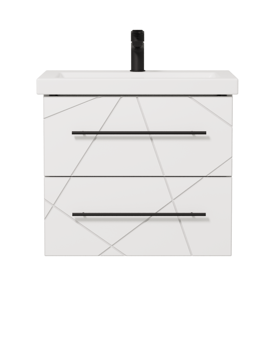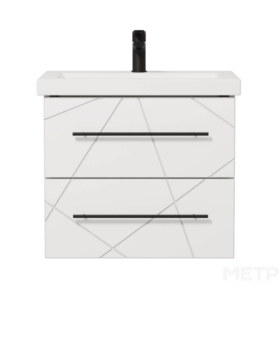 Подвесная тумба из коллекции Геометрия — стильное решение в цвете белый глянец с элегантной фрезеровкой геометрического рисунка и черными ручками-рейтингами. Два выдвижных ящика с доводчиками обеспечивают плавное закрывание и удобную систему хранения. Тумба комплектуется умывальником Cersanit Como 600. Тумба Геометрия идеально впишется в современные и скандинавские интерьеры, придавая ванной комнате изысканность и функциональность.