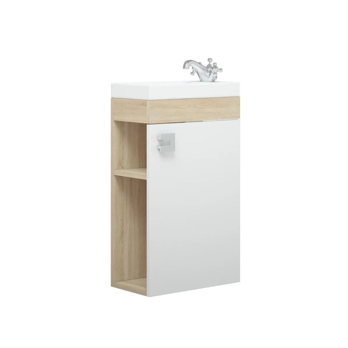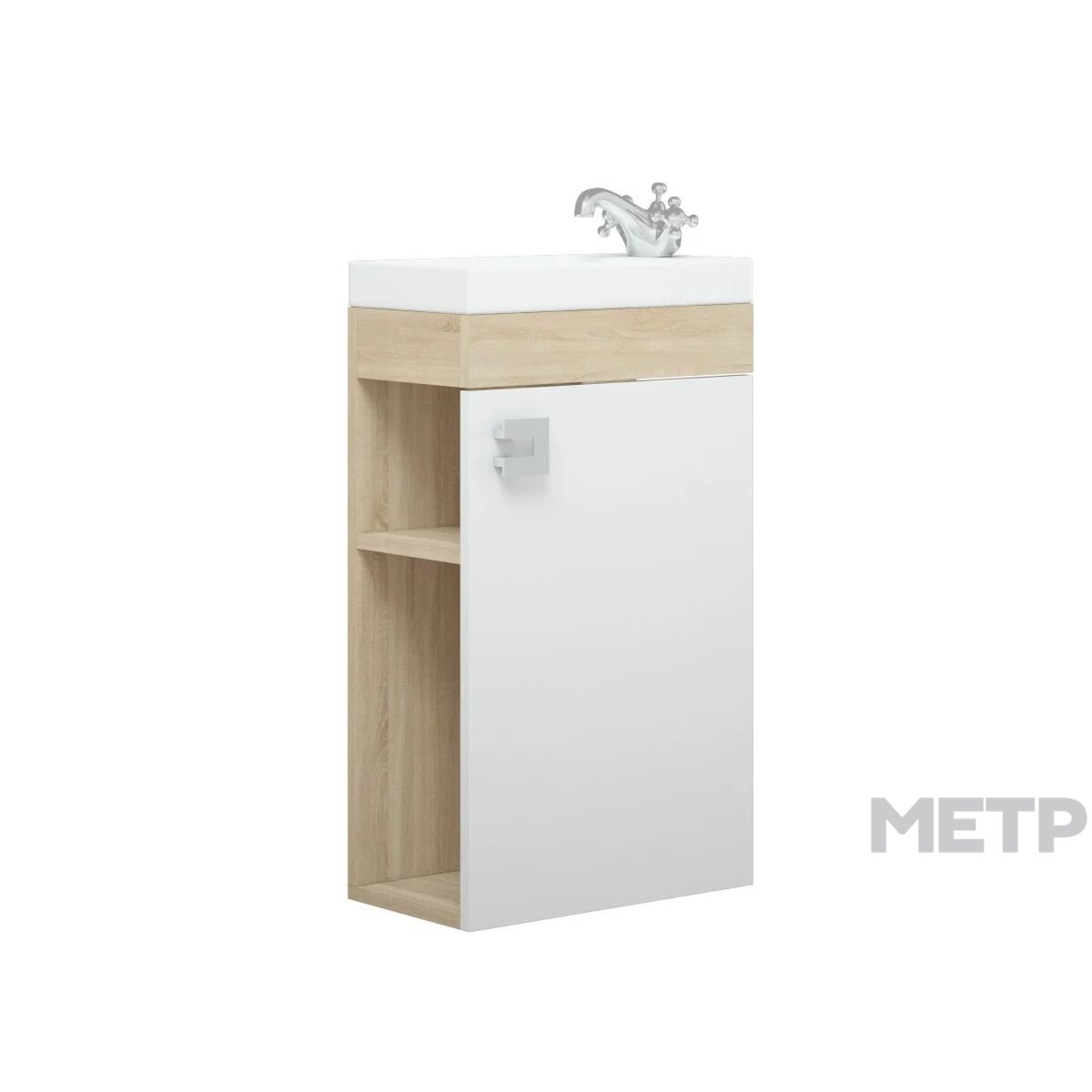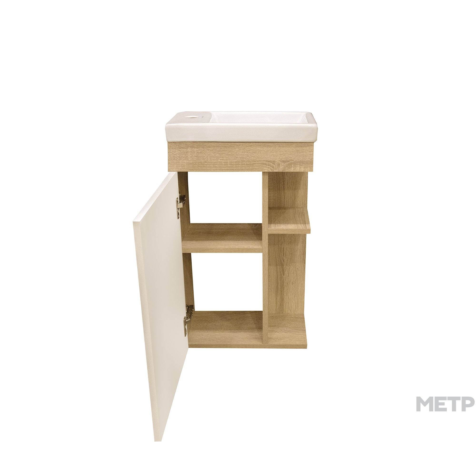 Тумба Koral Комо подвесная 40см сонома для компактного размещения. Модель особенно востребована в миниатюрных ванных комнатах. Приятное сочетание белого со вставками под дерево украсят зону умывания. А надежные влагостойкие материалы обеспечат долгое служение и новый вид. Тумба имеет одну дверцу и открытые полки сбоку. Для этой модели разработана раковина Комо 40.