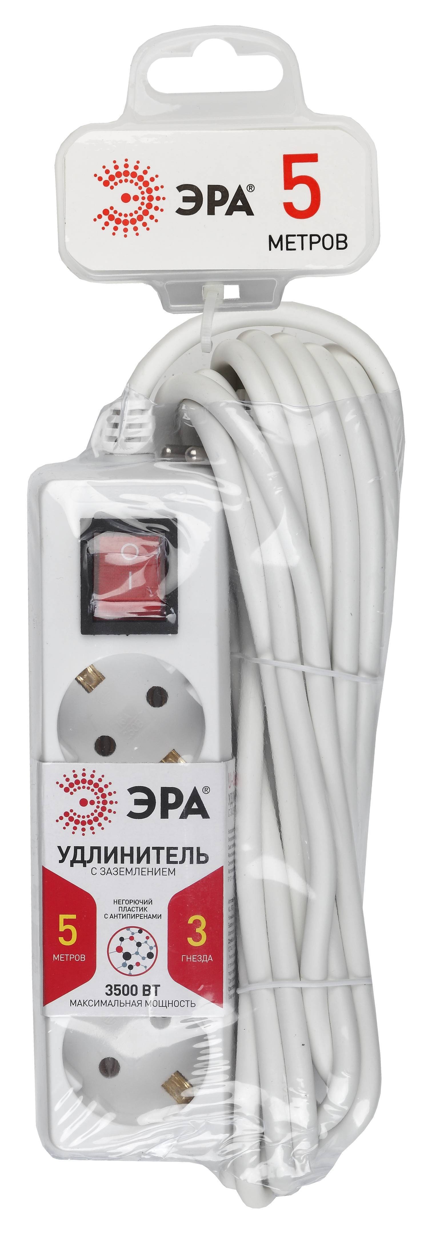 Удлинитель бытовой ЭРА 3 розетки с выключателем с заземлением 5 м 16А белый IP20 сделает ваш быт комфортнее с подключением к электросети отдаленной от нее домашней электроники. Изделие изготовлено из негорючего пластика, стойкого к механическим воздействиям. Медный провод обеспечивает пожарную безопасность. Допускается нагружать устройство до 3500 Вт. Произведено в России.
