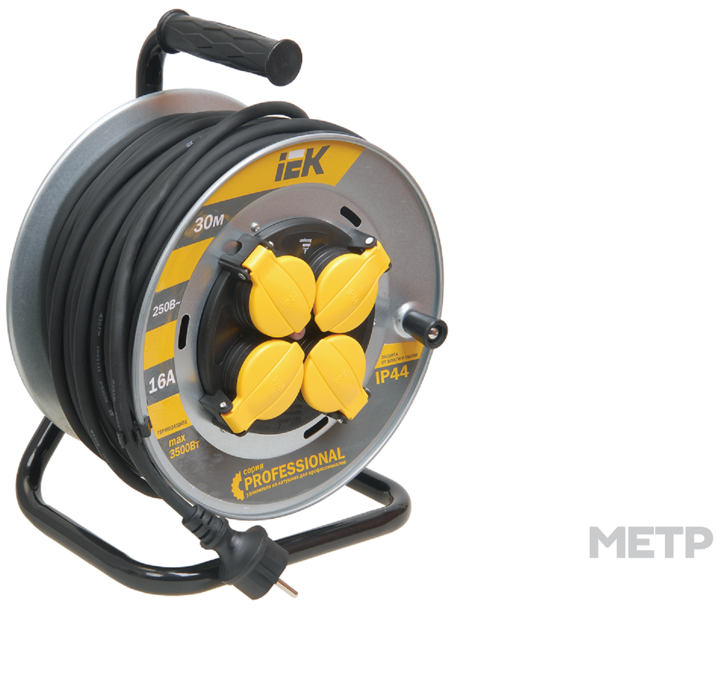 Удлинитель на катушке IEK PROFESSIONAL 4 розетки без выключателя с заземлением 30 м 16А желтый/черный IP44 с помощью которого легко подключить удаленное на расстояние до 30 м от стационарной розетки электрооборудование. Тепловое реле защищает от превышения максимально допустимой подключаемой нагрузки. Незаменим на строительной площадке, на садовом участке, в малом бизнесе, в парках с аттракционами, в промышленности и в быту.