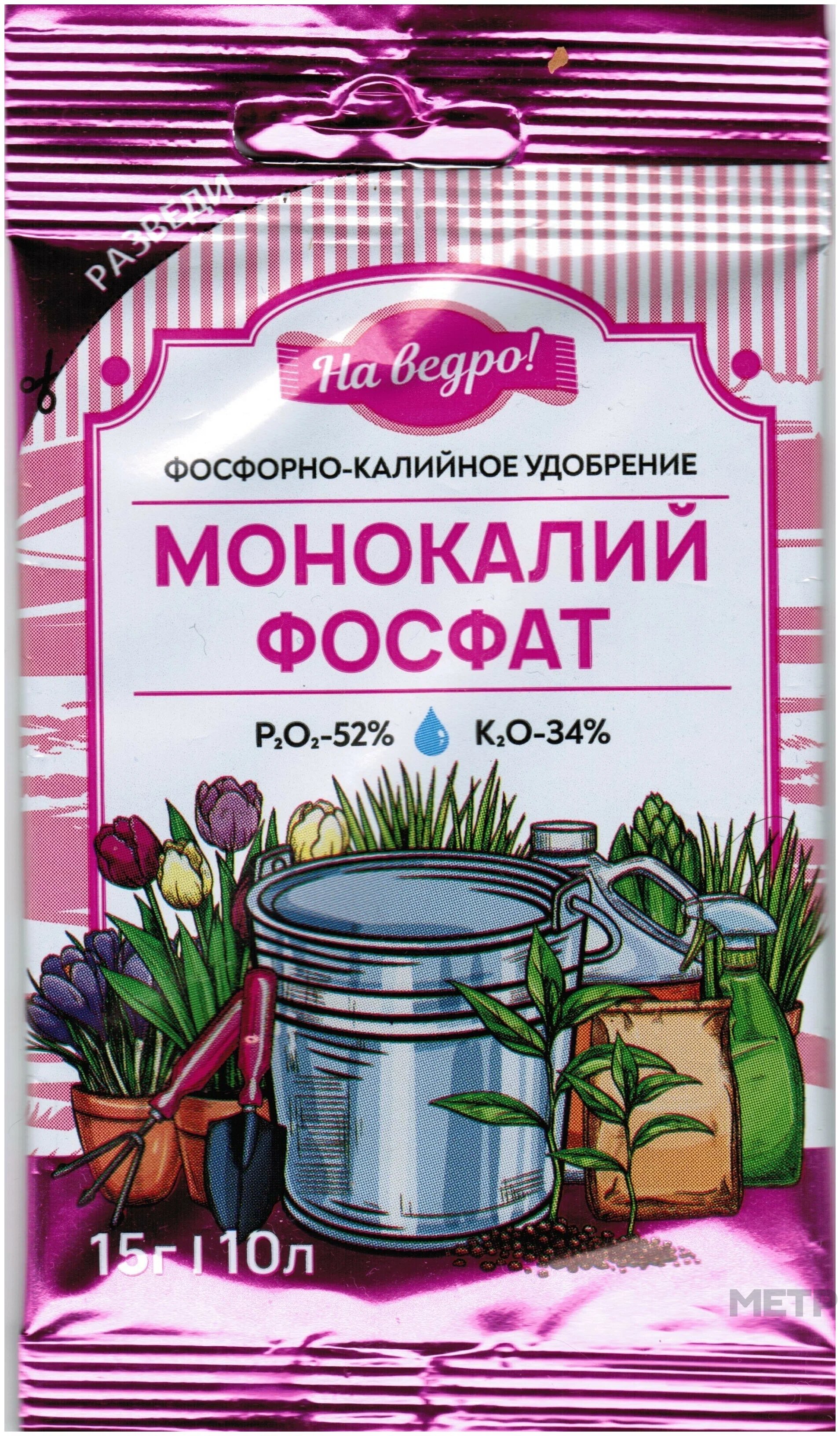 Удобрение Монокалийфосфат 15г -водорастворимое удобрение для подкормки растений в защищённом и открытом грунте. Обеспечивает максимальное плодоношение, ускоряет наступление и продлевает цветение цветочных культур, способствует лучшей зимовке деревьев и кустарников.