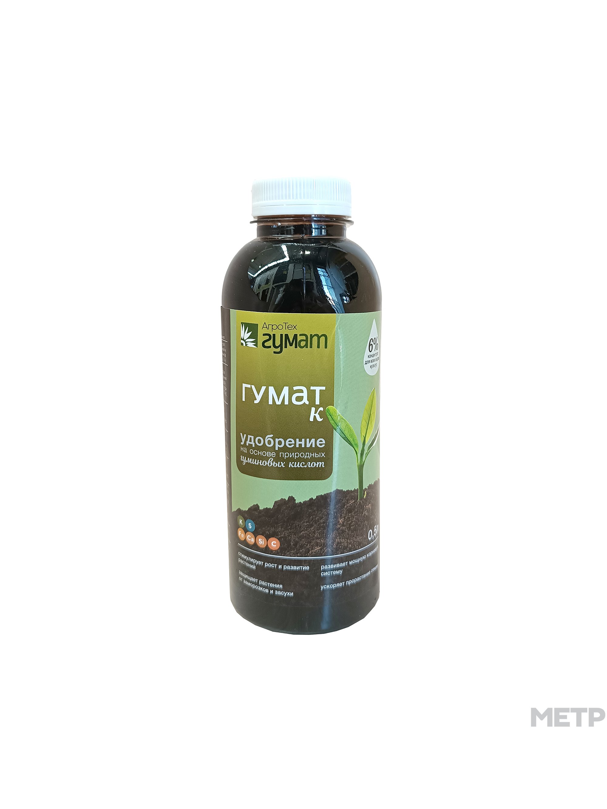 Удобрение АгроТех гумат Гумат Калия 0,5 л - удобрение на основе гуминовых кислот, - предназначен для предпосевной обработки семян и посадочного материала, а также для подкормок в период вегетации при выращивании зерновых, технических, овощных, плодово-ягодных, цветочно-декоративных культур (в т. ч. комнатных растений), в открытом и защищенном грунтах с целью ускорения роста и развития растений, повышения их устойчивости к неблагоприятным условиям выращивания, увеличения урожайности и улучшения его качества. Применяется в виде водных растворов концентрацией 0,007 - 0,01% по основному веществу. При использовании гуматов в сельском хозяйстве имеет место: увеличение урожайности сельскохозяйственных культур; ускорение процессов всхожести семян и их прорастания; улучшение обмена веществ у растений, усиление поглощения минеральных веществ и корнеобразования; улучшение приживаемости рассады и растений при пересадке; увеличение сопротивляемости растений к болезням, заморозкам, засухе.