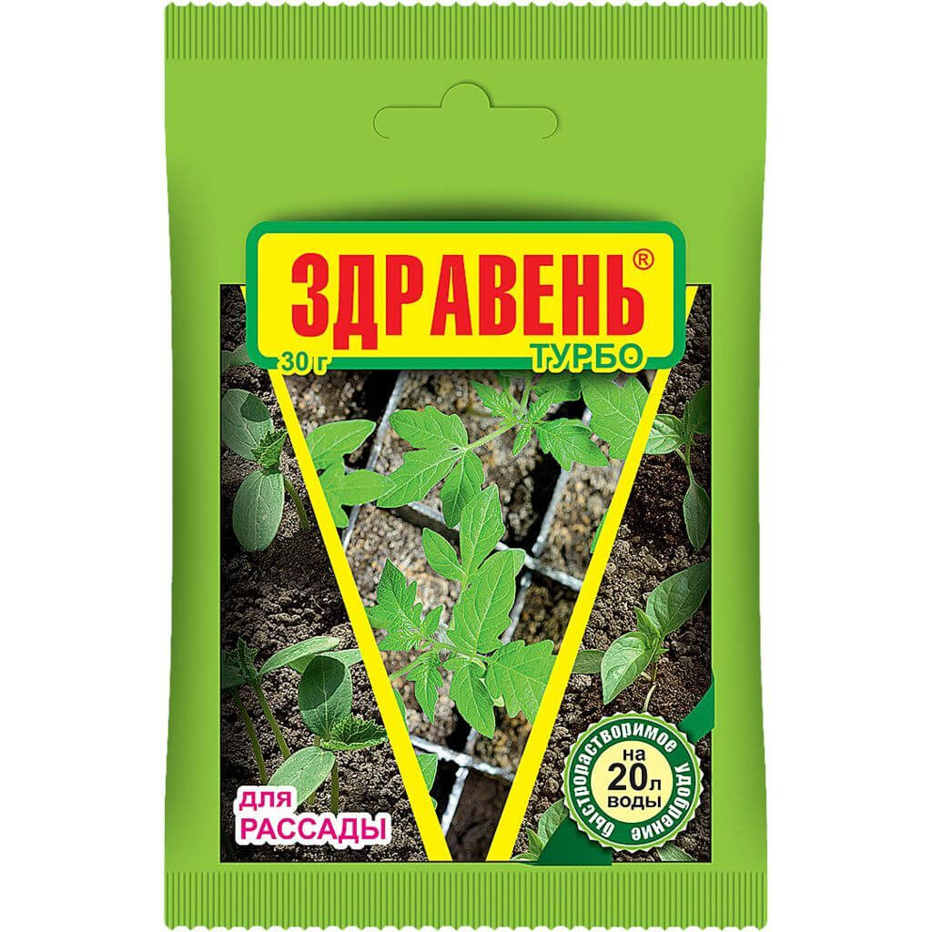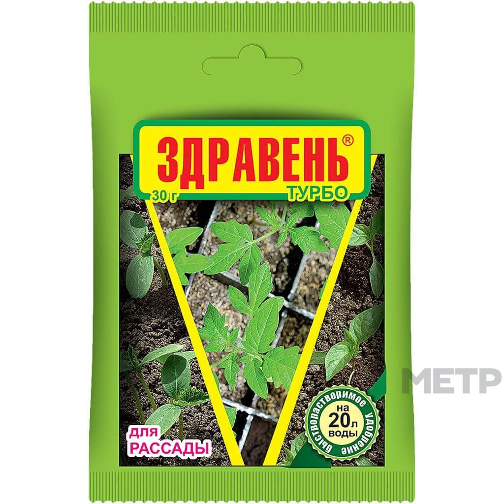 Удобрение Здравень Турбо Рассада 30г водорастворимое удобрение с полным сбалансированным комплексом питательных веществ необходимых для нормального роста и развития рассады. Стимулирует рост корневой системы, улучшает приживаемость при пересадке и пикировки. Состав: N 13%, P 6%, K 26%, Mg 2,5%, гумат натрия 2%; B 0,03%, Mn 0,04%, Zn 0,02%, Cu 0,02%, Mo 0,005%