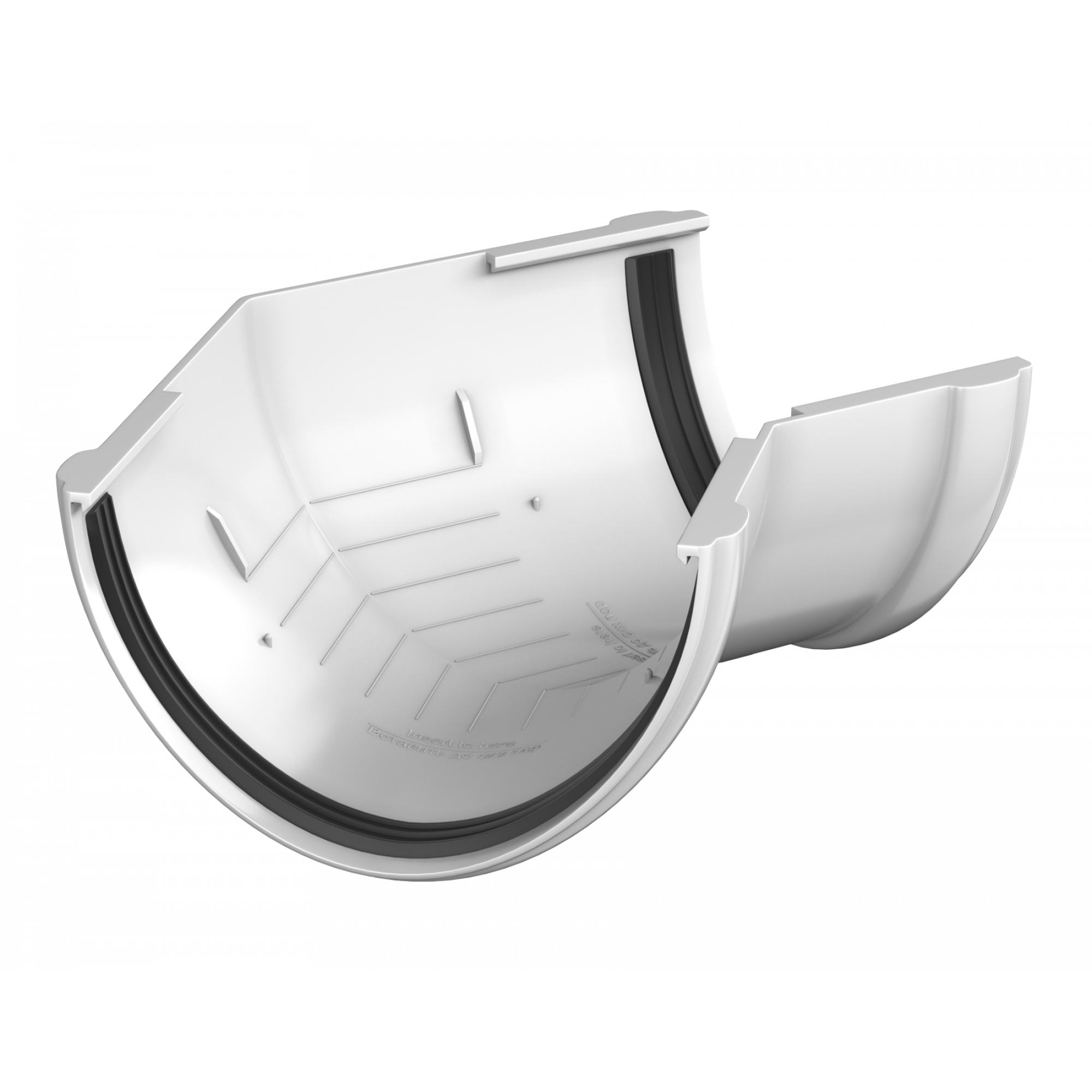 Угол желоба устанавливается на внешних и внутренних углах кровли и предназначен для соединения желобов под углом 135 градусов в целях изменения направления движения воды.