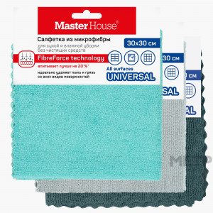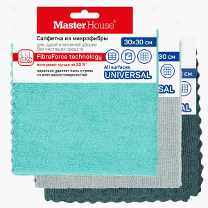 Салфетка для уборки универсальная MasterHouse 30х 30 см отлично подходит для сухой и влажной уборки. Микрофибра захватывает и удерживает самые мелкие частички пыли. Чтобы очистить салфетку, достаточно сполоснуть ее в проточной воде.
