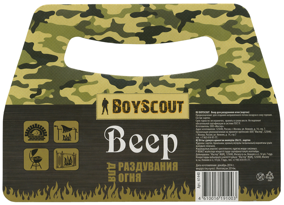 Веер для розжига огня (15х21 см), выполнен из картона. Бюджетный вариант простого веера, который подойдет для того, чтобы помочь в разжигании костра несколько раз. Оправданное решение за свои деньги. Наличие такого изделия под рукой в нужный момент позволит решать текущие задачи с комфортом.