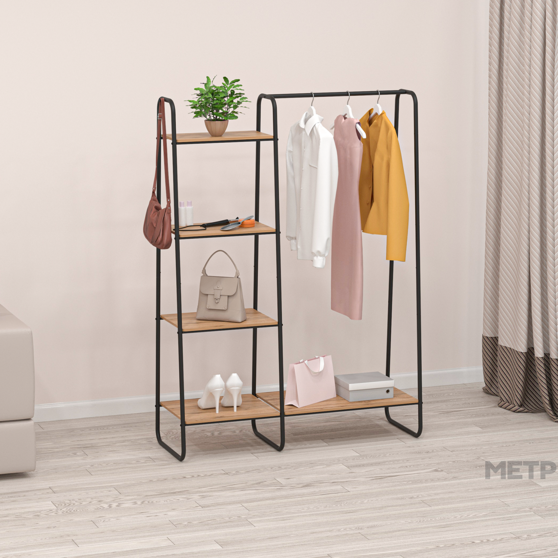 Полки стеллажа сделаны из ЛДСП. На перекладине можно разместить как плечики, так и подвесить цветы.