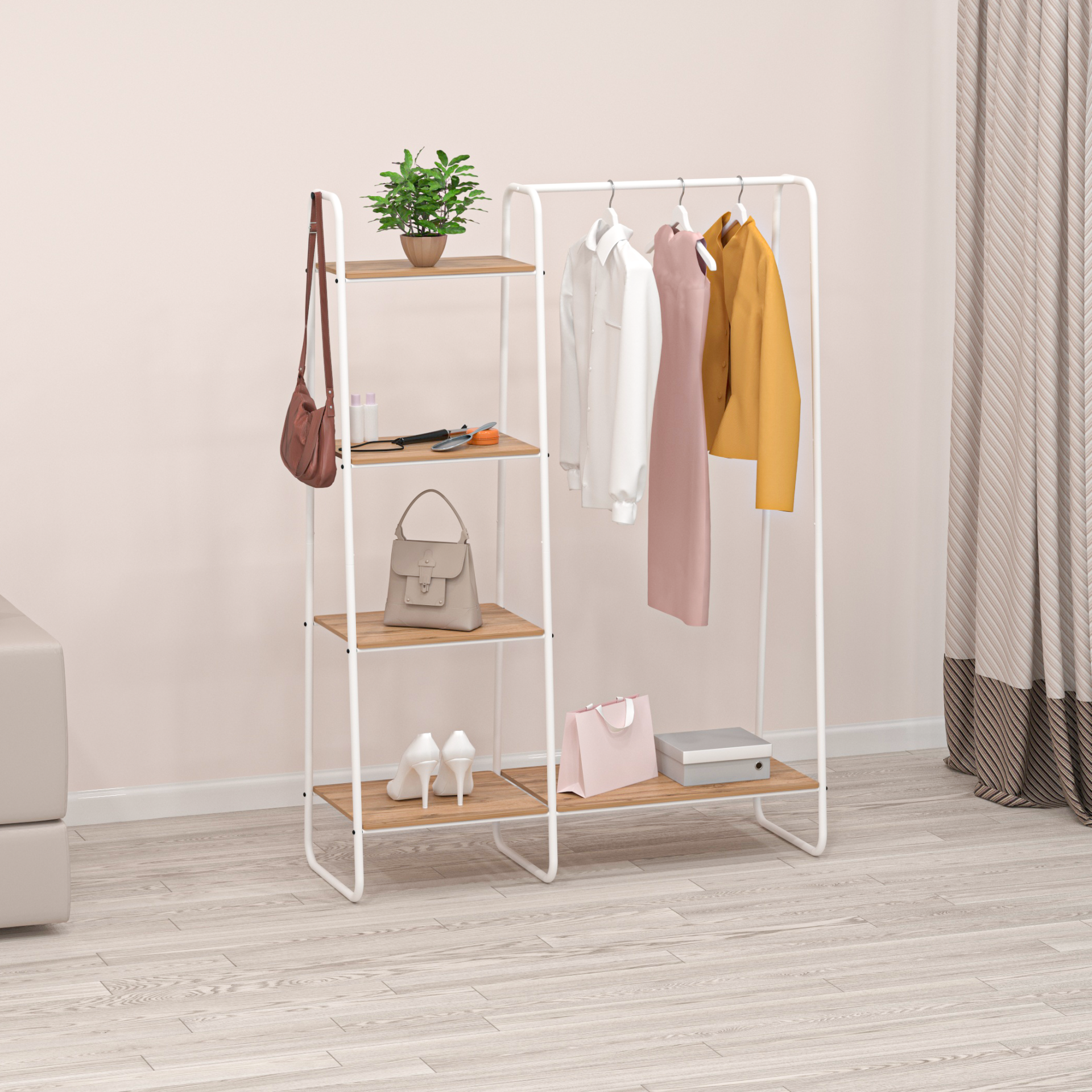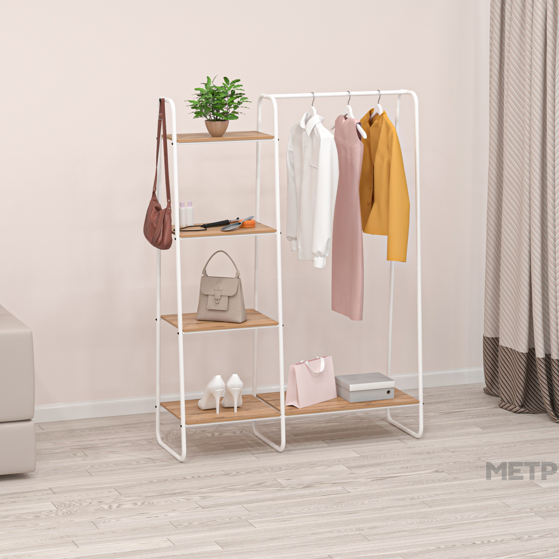 Полки стеллажа сделаны из ЛДСП. На перекладине можно разместить как плечики, так и подвесить цветы.