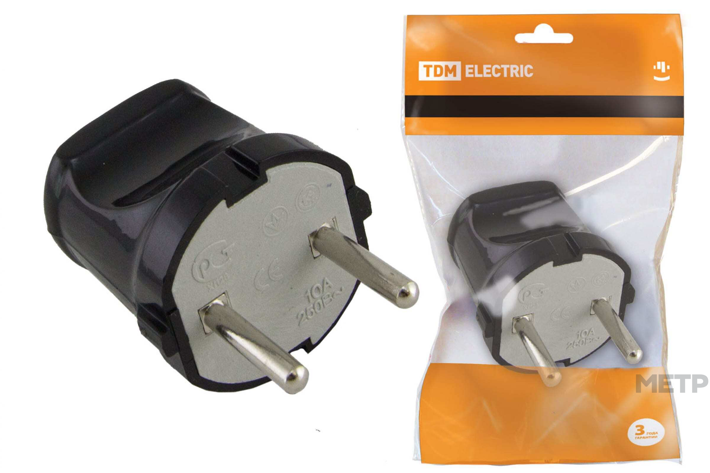 Вилка штепсельная TDM 6А 250В 2К чёрная прямая IP20 без заземления - электрическая разборная штепсельная вилка, предназначенная для присоединения (разъединения) к электрической сети различных электрических приборов бытового назначения мощностью до 1,2 кВт. Можно произвести ремонт электрошнура в случае выхода из строя или повреждения неразборной вилки. Корпус выполнен из самозатухающего АБС-пластика, обеспечивающего прочность, термостойкость изделия и устойчивость к воздействию солнечных лучей. Контактная группа изготовлена из латуни. Применение: жилые помещения (дома, квартиры и т.д.), объекты коммерческой недвижимости (офисы, торговые центры и т.д.), инфраструктурные объекты (больницы, школы и т.д.).
