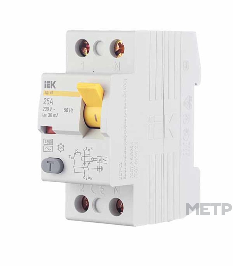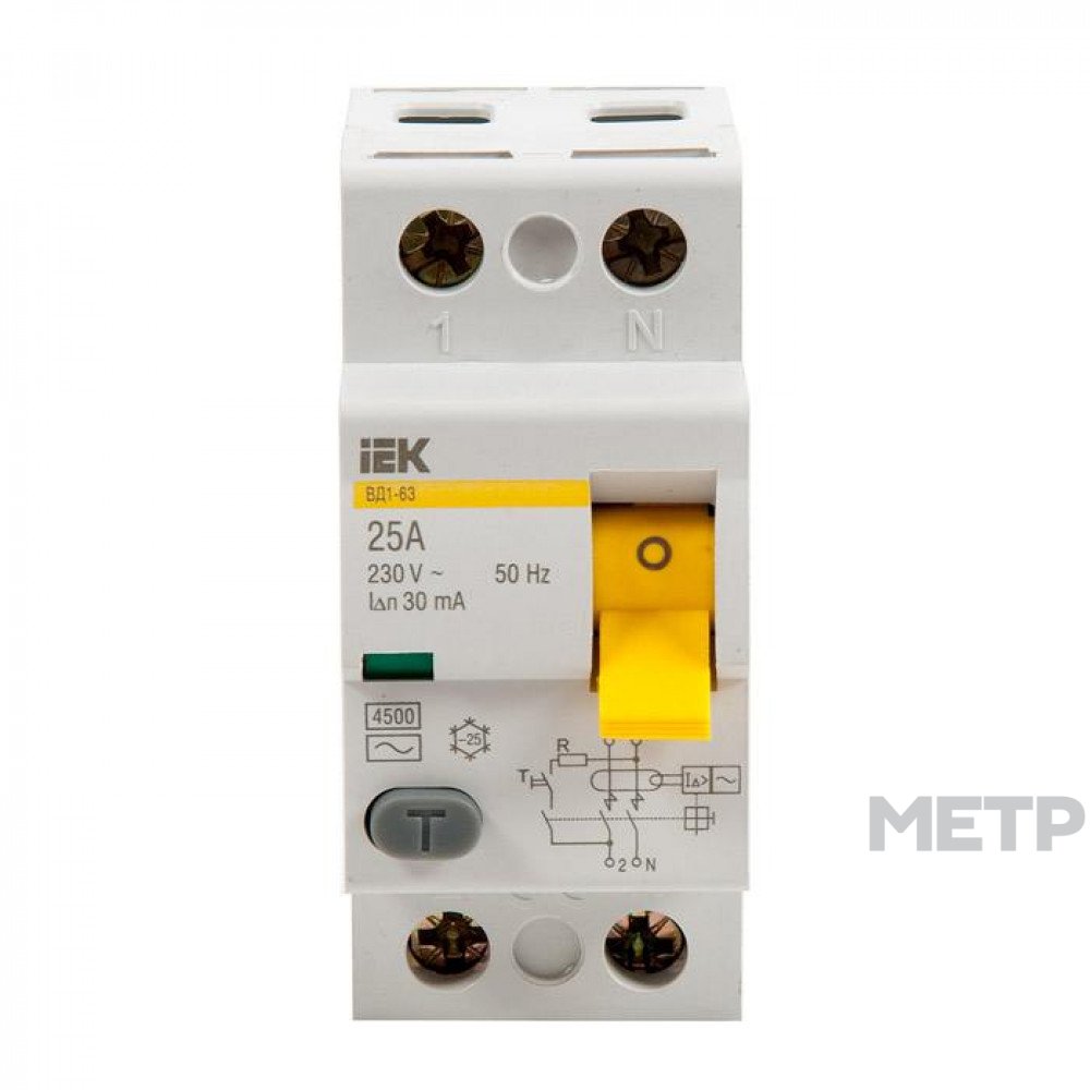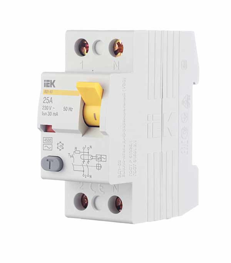 Выключатель дифференциальный (УЗО) ВД1-63 IEK 2P 25A 30мА без встроенной защиты от сверхтоков реагирует не только на синусоидальные переменные дифференциальные токи, но и на пульсирующие постоянные дифференциальные токи. Источником пульсирующего тока являются, например, стиральные машины с регуляторами скорости, регулируемые источники света, телевизоры, видеомагнитофоны, персональные компьютеры и др. Дифференциальный выключатель ВД 1-63 тип А соответствует требованиям ГОСТ 50326 и ГОСТ 50807 как дифференциальный выключатель, "функционально не зависящий от источника питания". Дифференциальный выключатель ВД 1-63 тип А предназначен для защиты человека от поражения электрическим током при случайном непреднамеренном прикосновении к токоведущим частям электроустановок в сетях переменного тока напряжением 230/400 В и частотой 50 Гц.