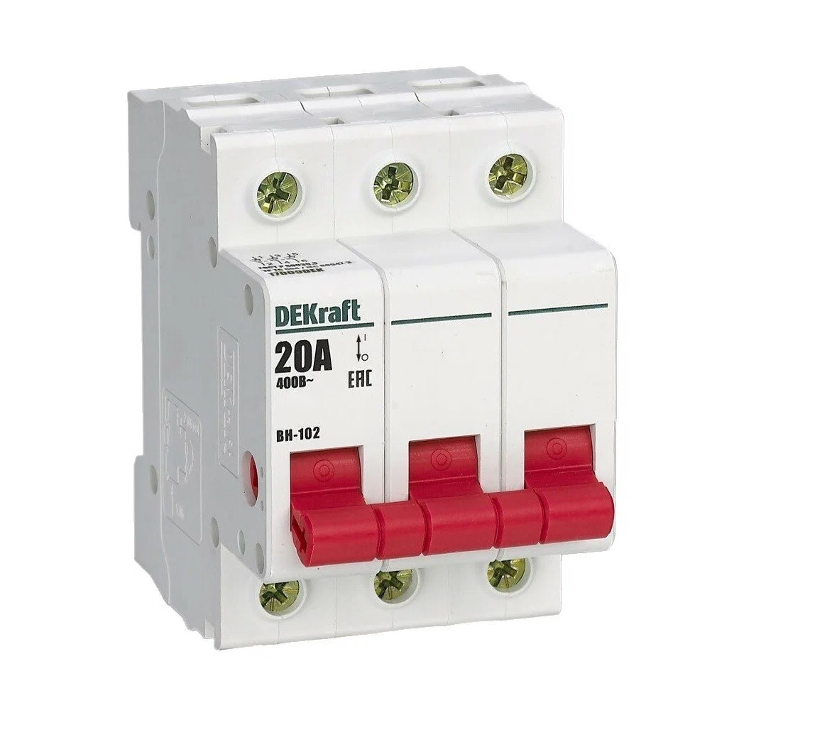 Выключатель нагрузки Dekraft ВН-102 3P 20А, может эксплуатироваться при номинальном напряжении 400 В, максимальное сечение подключаемого кабеля 16 кв.мм. Степень защиты IP20. Применяется в распределительных, квартирных, этажных щитах жилых и административных зданий, а также промышленных объектов.