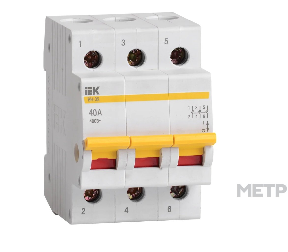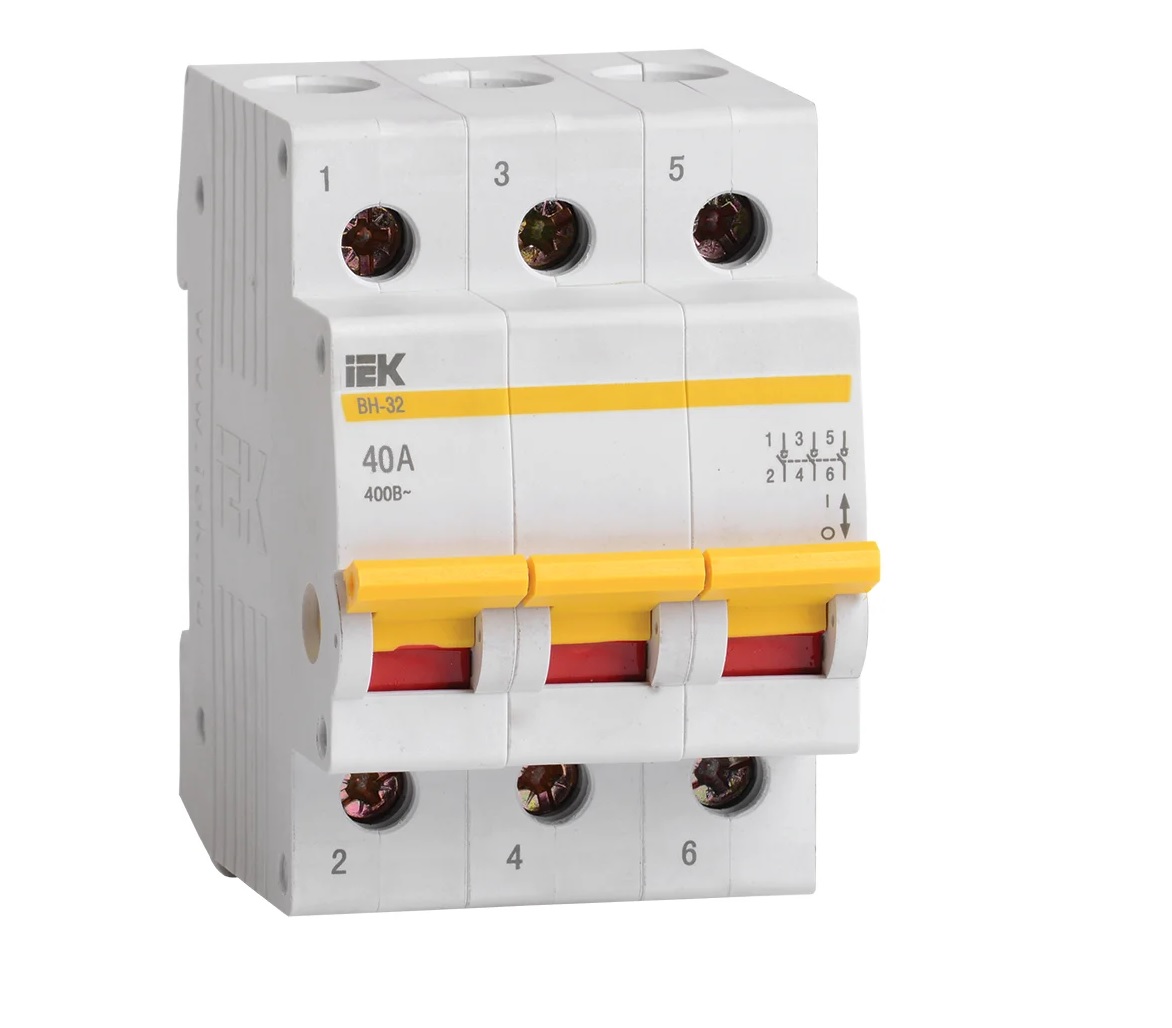 Выключатель нагрузки IEK ВН-32 3P 40А, номинальное расчетное напряжение — 400 В. Для подключения используется кабель максимальным сечением 35 кв.мм. Устройство применяется для оперативного соединения и разъединения цепи, можно использовать в условиях повышенных нагрузок — в производственных и офисных зданиях, в загородных домах, жилищном секторе