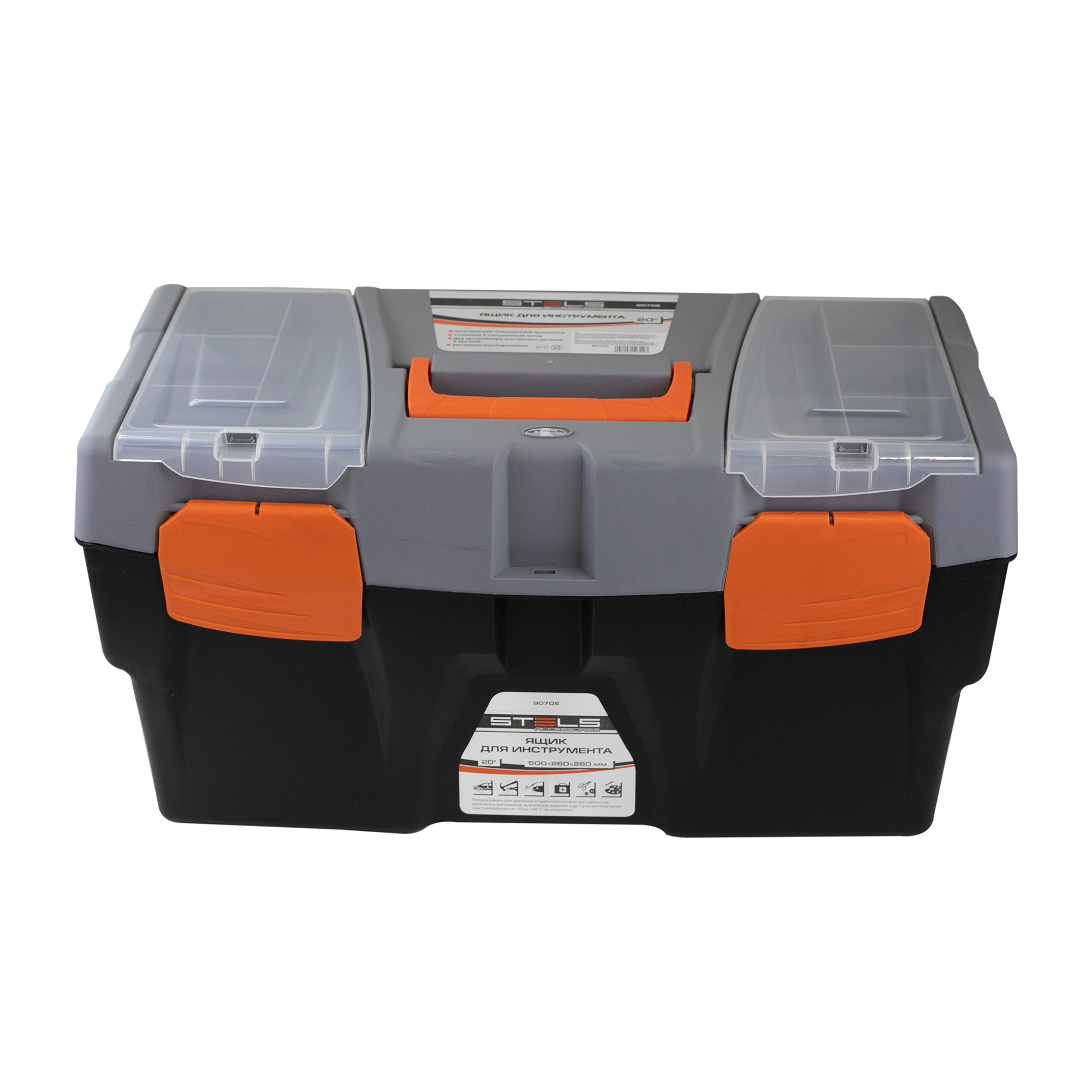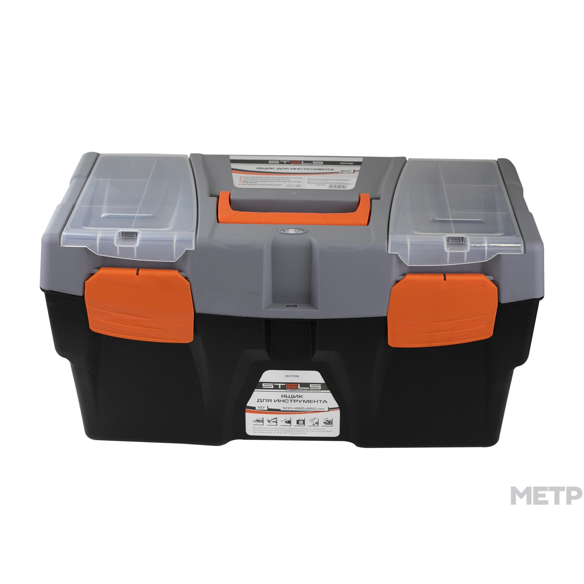 Ящик STELS 50*26*26 см имеет множество дополнительных секций для хранения и транспортировки мелких инструментов и крепежных изделий. Встроенные контейнеры создают дополнительные удобства, надежные пластиковые замочки позволяют закрепить инструменты и перенести в нужное место. Имеется петля для навесного замка.