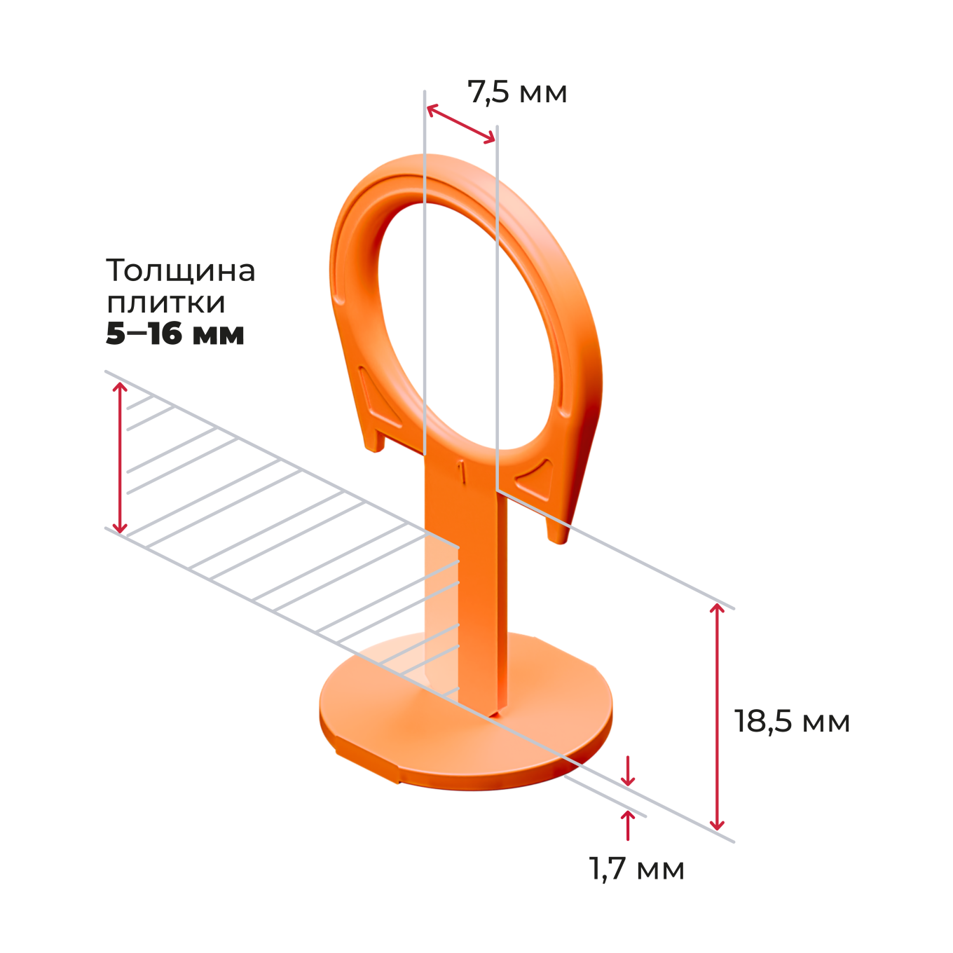 Оранжевые зажимы-кольца (СВП) для швов в 1 мм. Гибкие, не ломаются при монтаже. Легко установить указательным и большим пальцами. Демонтируются легким ударом киянкой по ребру. Подходят для плитки, керамогранита и мрамора толщиной от 5 до 16 мм. Для монтажа рекомендуем применять клинья и щипцы производства «АКОР».