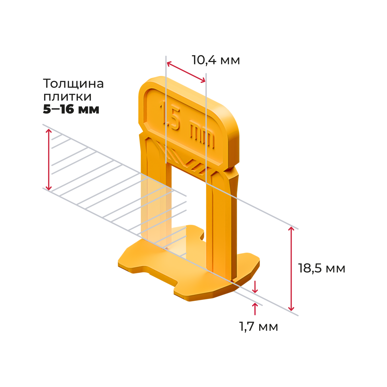 Желтые зажимы-ворота (СВП) для швов в 1,5 мм. Гибкие, не ломаются при монтаже. Демонтируются легким ударом киянкой по ребру. Подходят для плитки, керамогранита и мрамора толщиной от 5 до 16 мм. Для монтажа рекомендуем применять клинья и щипцы производства «АКОР».