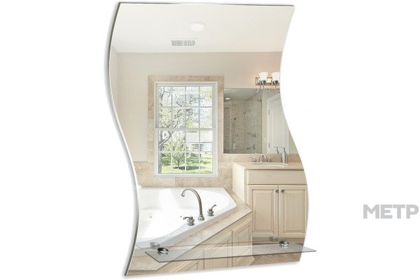 Зеркало 60х43 см Мир Зеркал Комфорт Волна нестандартной формы станет отличным стильным решением для того, чтобы разбавить интерьер ванной комнаты. Само зеркало выполнено из стекла, также есть полка для размещения предметов личной гигиены. Устанавливается подвесным путем, надежно прикрепляется к стене.