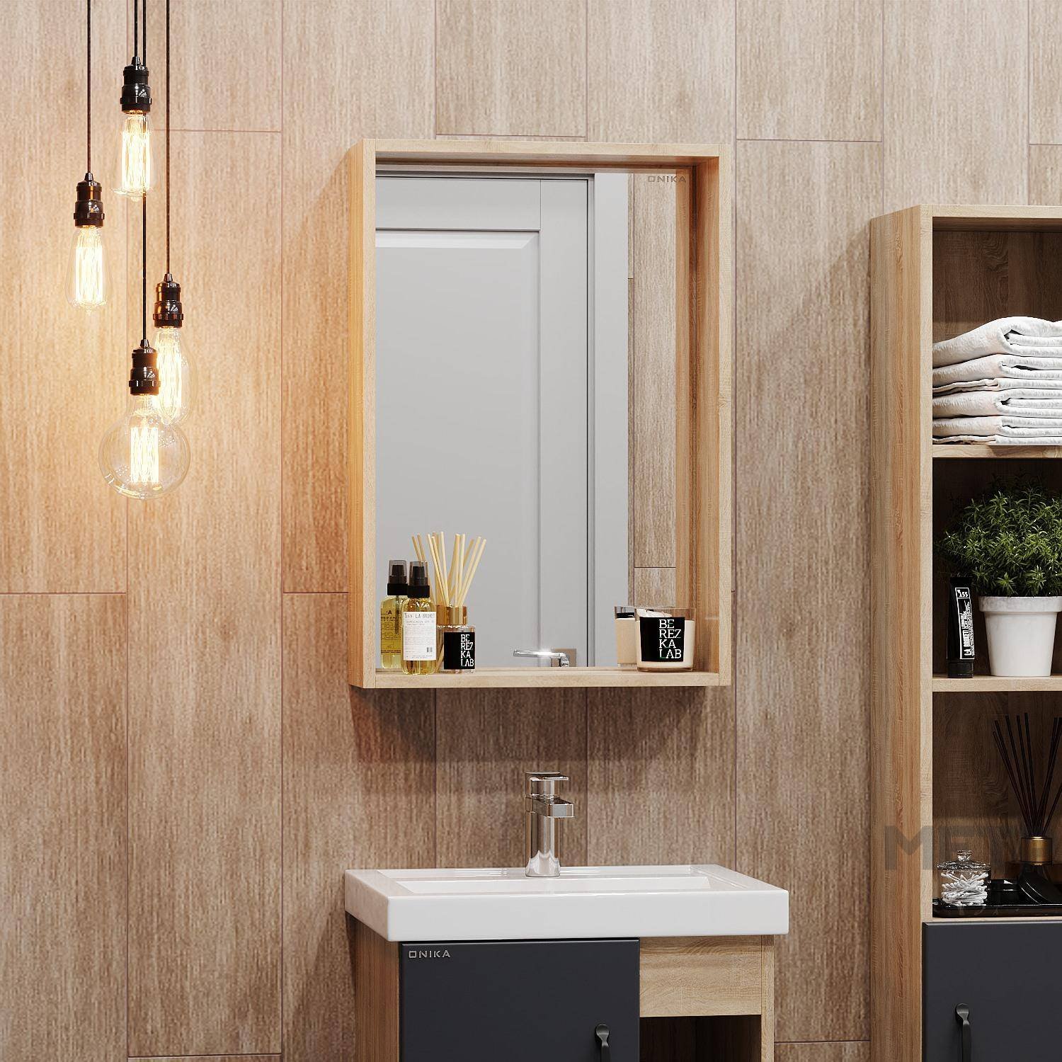 "Зеркало в ванную комнату Onika ТИМБЕР 48 отражает современные тенденции в дизайне мебели для ванных комнат: минимализм с простыми и понятными формами, цвета дуба с роскошной текстурой, отсутствие лишних деталей.