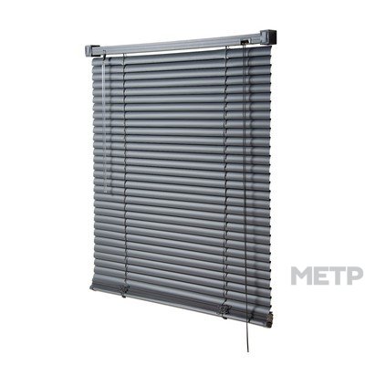 Жалюзи горизонтальные пластиковые с горизонтальным расположением ламелей для декорирования окна и защиты от света внутри помещений.